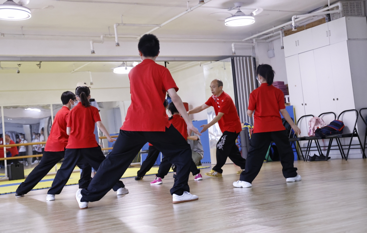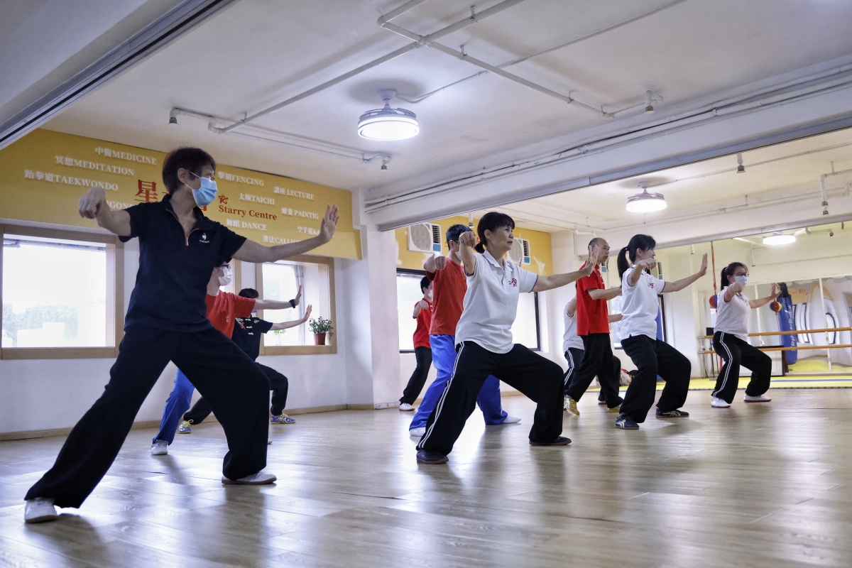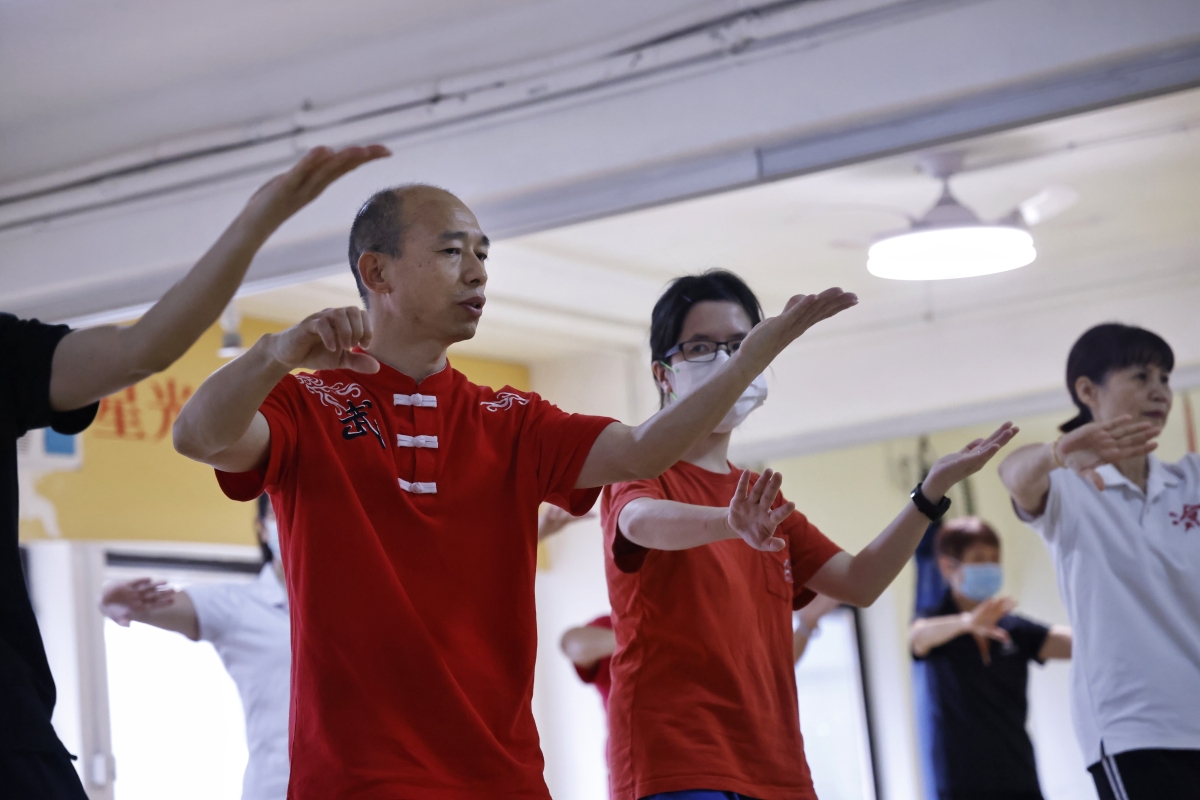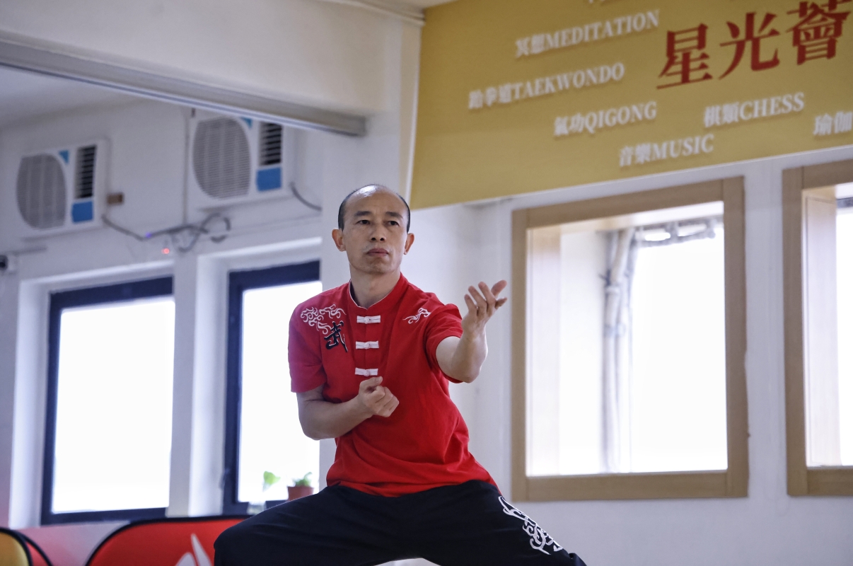 冷先鋒在授課中。 冷先鋒曾在河南學習太極,在深圳開班教學,如今在香港落地生根,他的徒弟也有幾百位。在星光薈裡,即使他的學生從小學到中老年,教學起來依然得心應手,有條不紊。