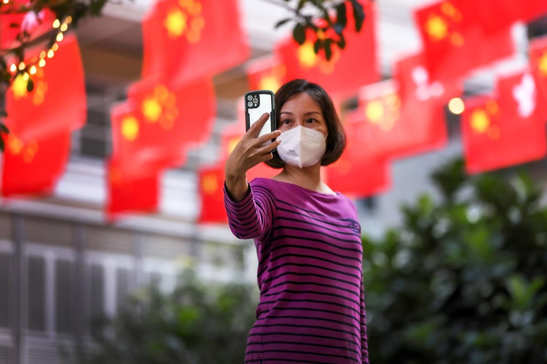 市民在灣仔利東街的旗海下自拍留念。 (香港中通社記者 徐文峰 攝)