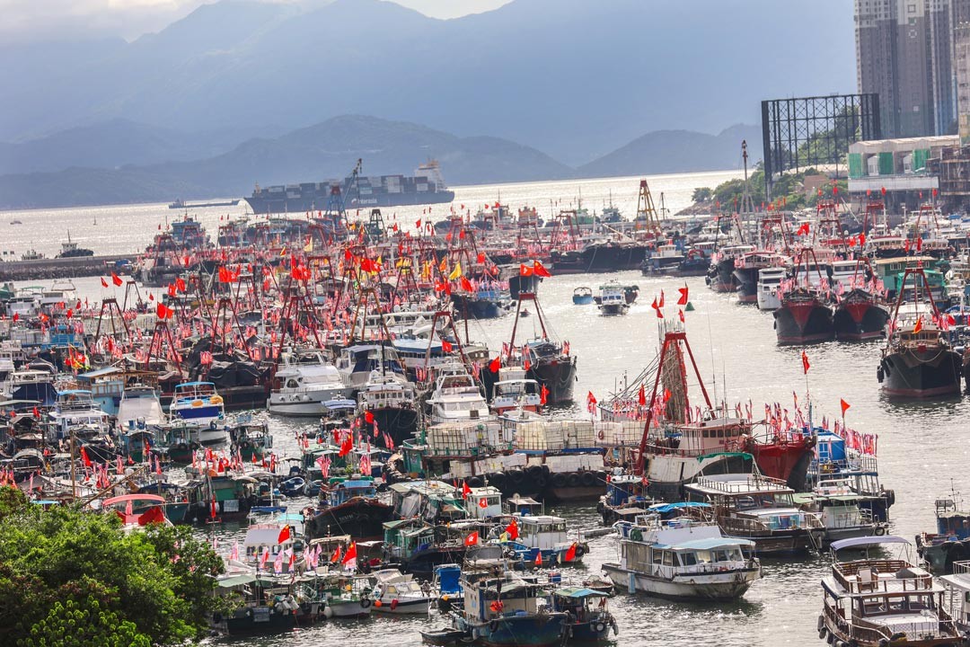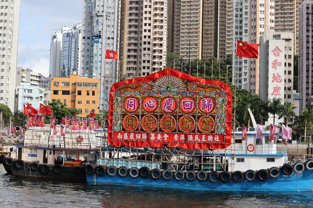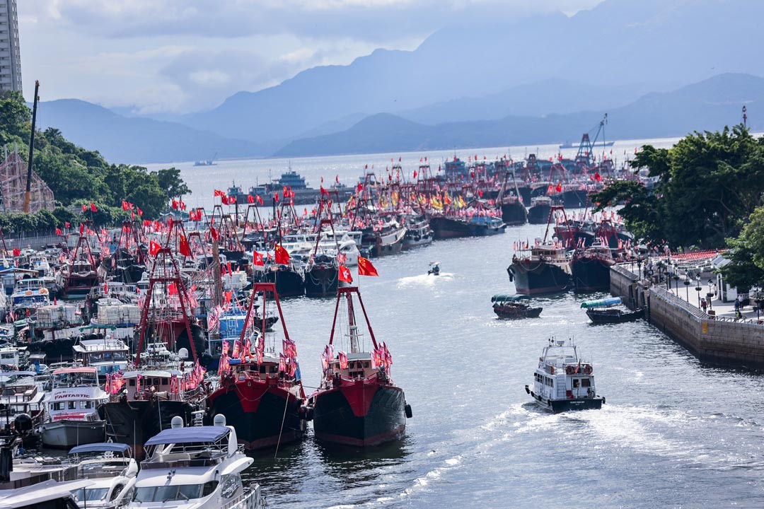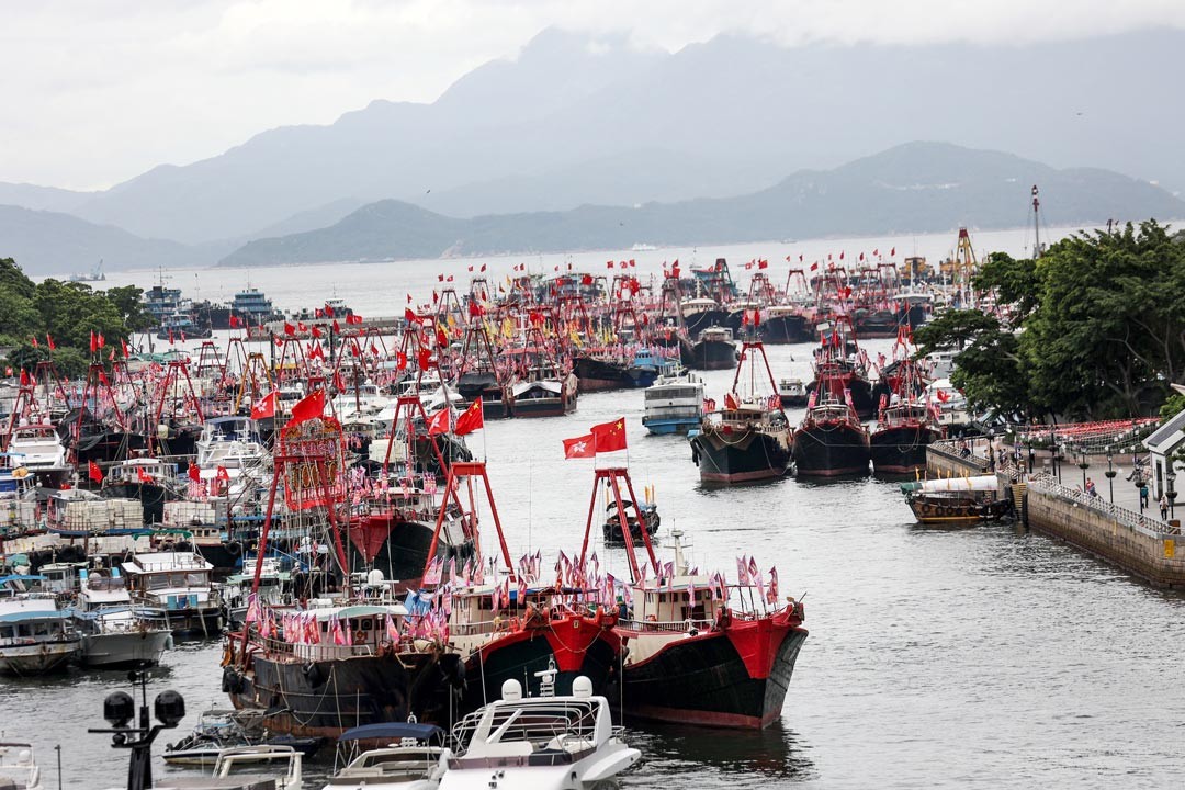 漁船插滿國旗、區旗及慶回歸的條幅。 (徐文峰 攝)