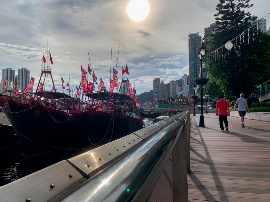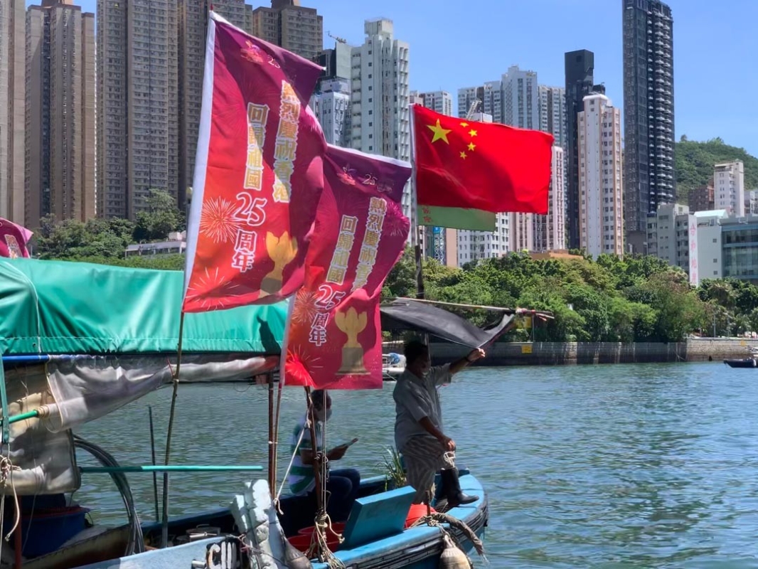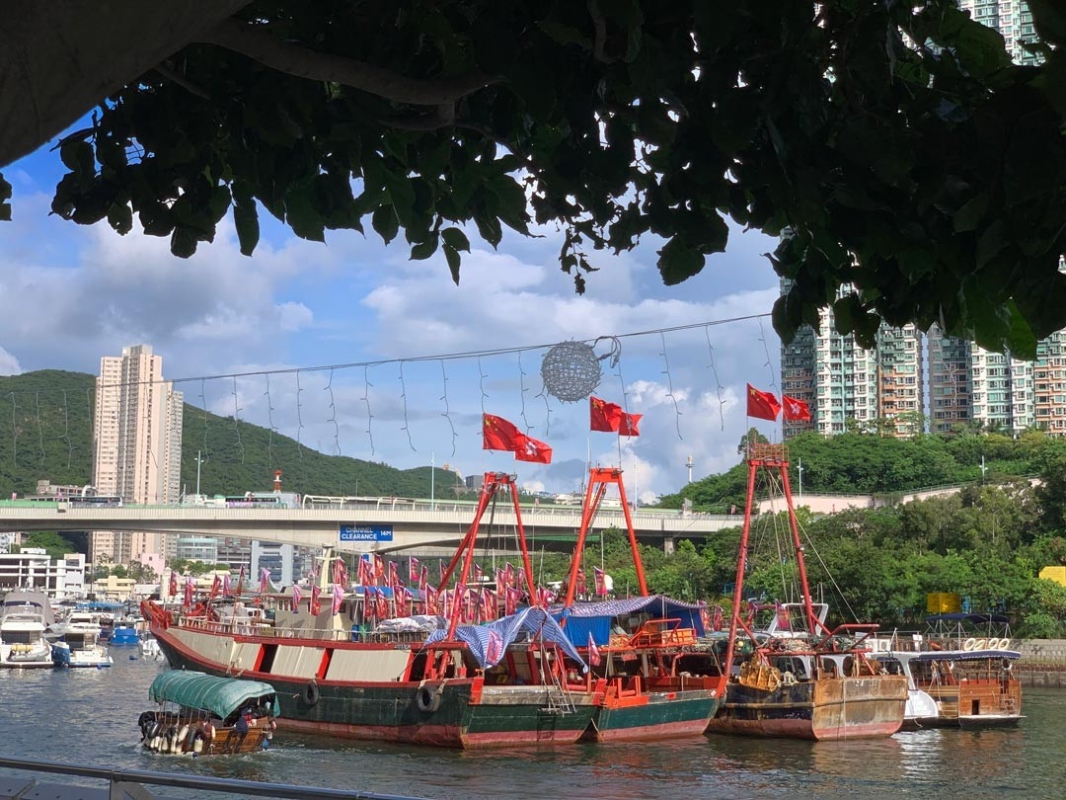 香港新聞網6月30日電 (記者 徐文峰)為慶祝香港回歸祖國25週年,香港仔避風塘多艘漁船掛上國旗和特區區旗,組成大片紅色旗海,蔚為壯觀。區內多處掛有慶回歸的旗幟和大型橫額,市面上洋溢著一片喜慶氣氛。