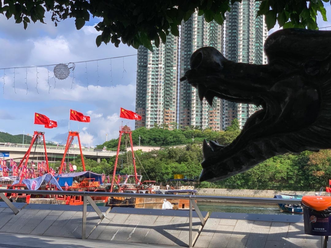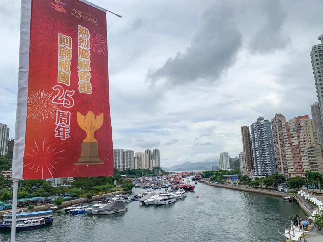 慶回歸的條幅在香港仔避風塘上方迎風招揚。 (徐文峰 攝) 【編輯:徐文峰】