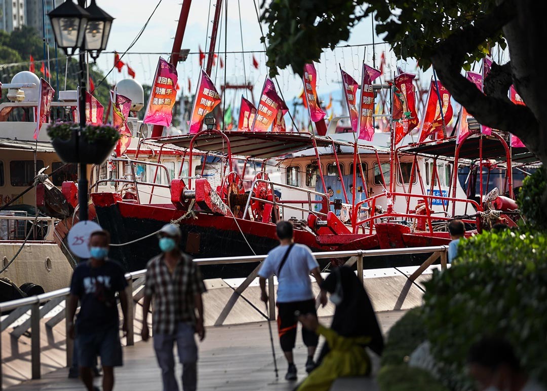 停在避風塘內的漁船插滿慶回歸的條幅。(徐文峰 攝)