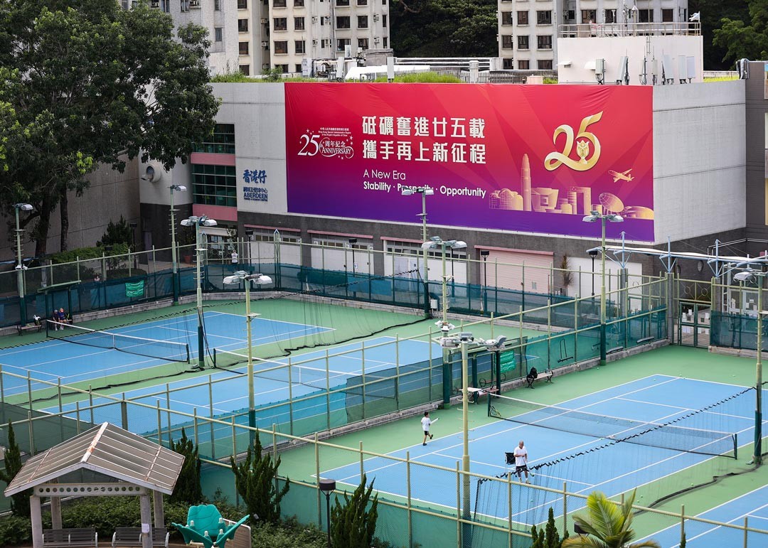 香港仔體育館外牆掛著慶回歸的大型橫額,為社區添色不少。(徐文峰 攝)