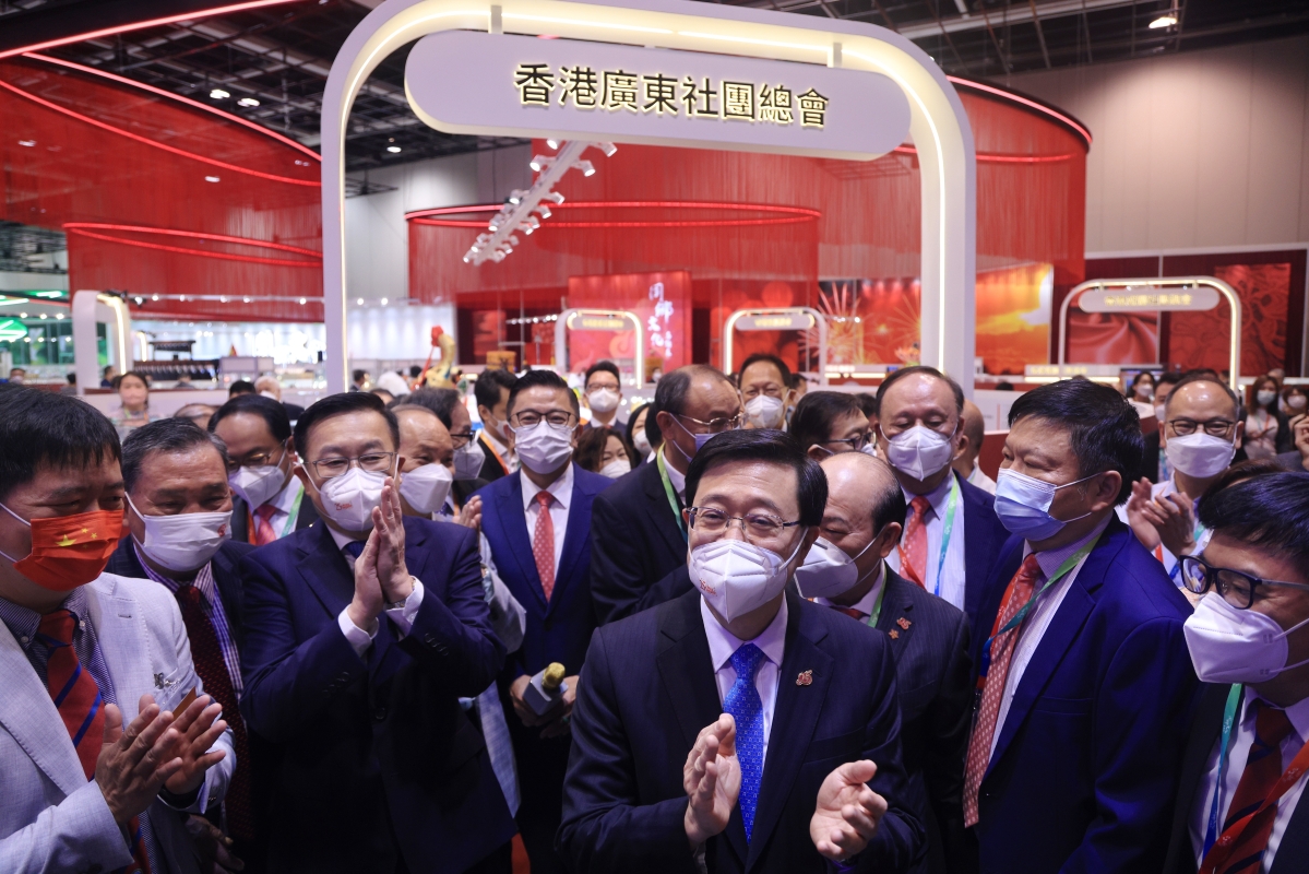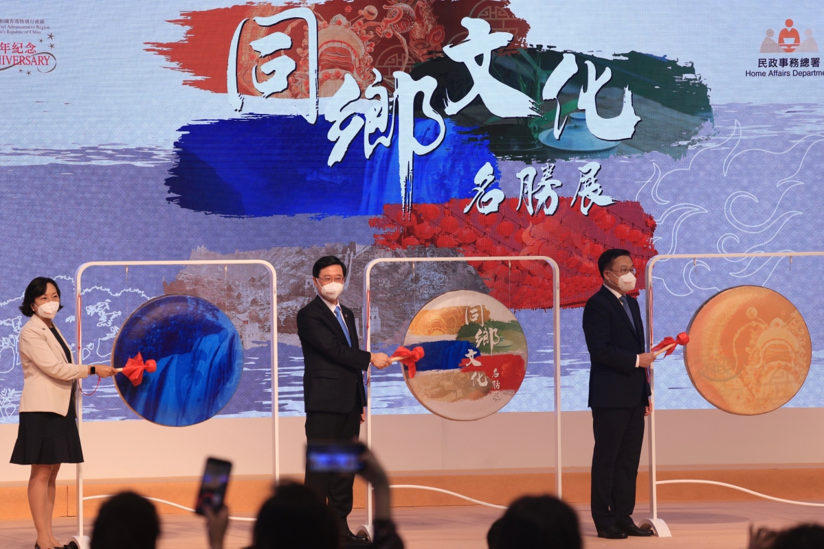 香港特區行政長官李家超(中)、香港中聯辦副主任何靖(右)、民政及青年事務局局長麥美娟(左)等嘉賓主禮開幕儀式