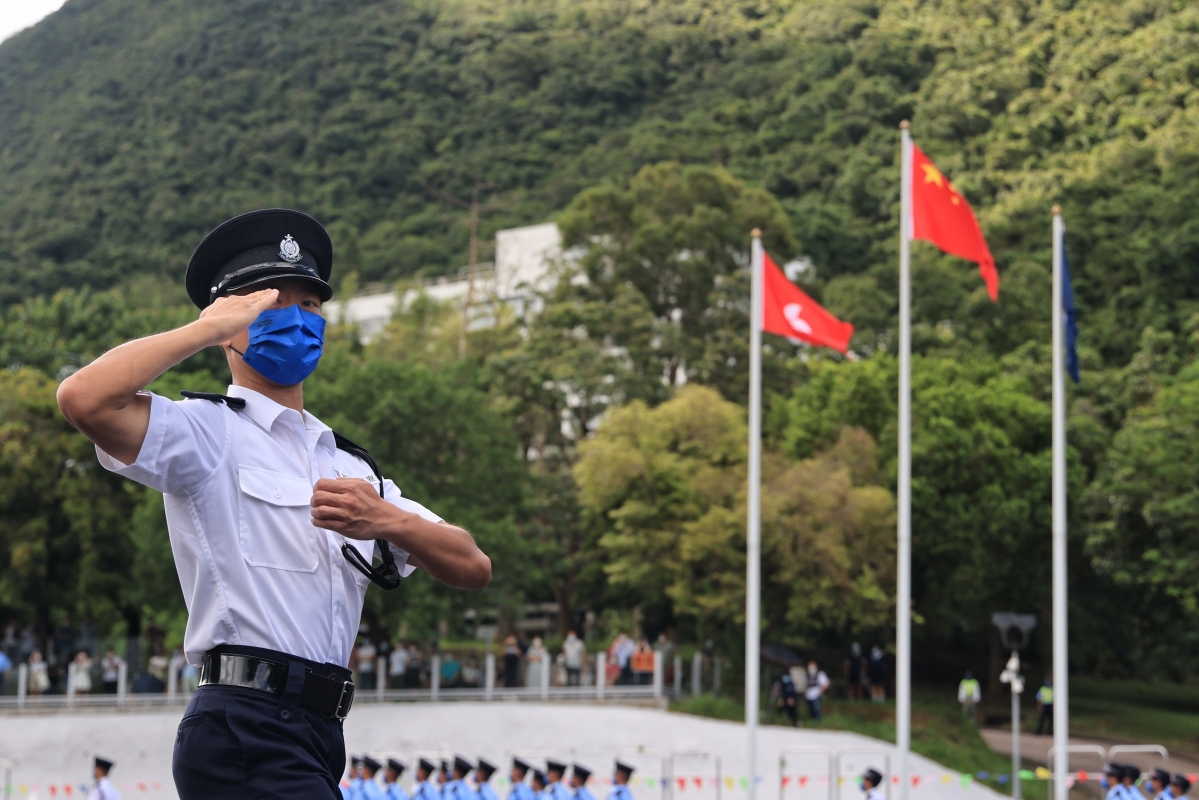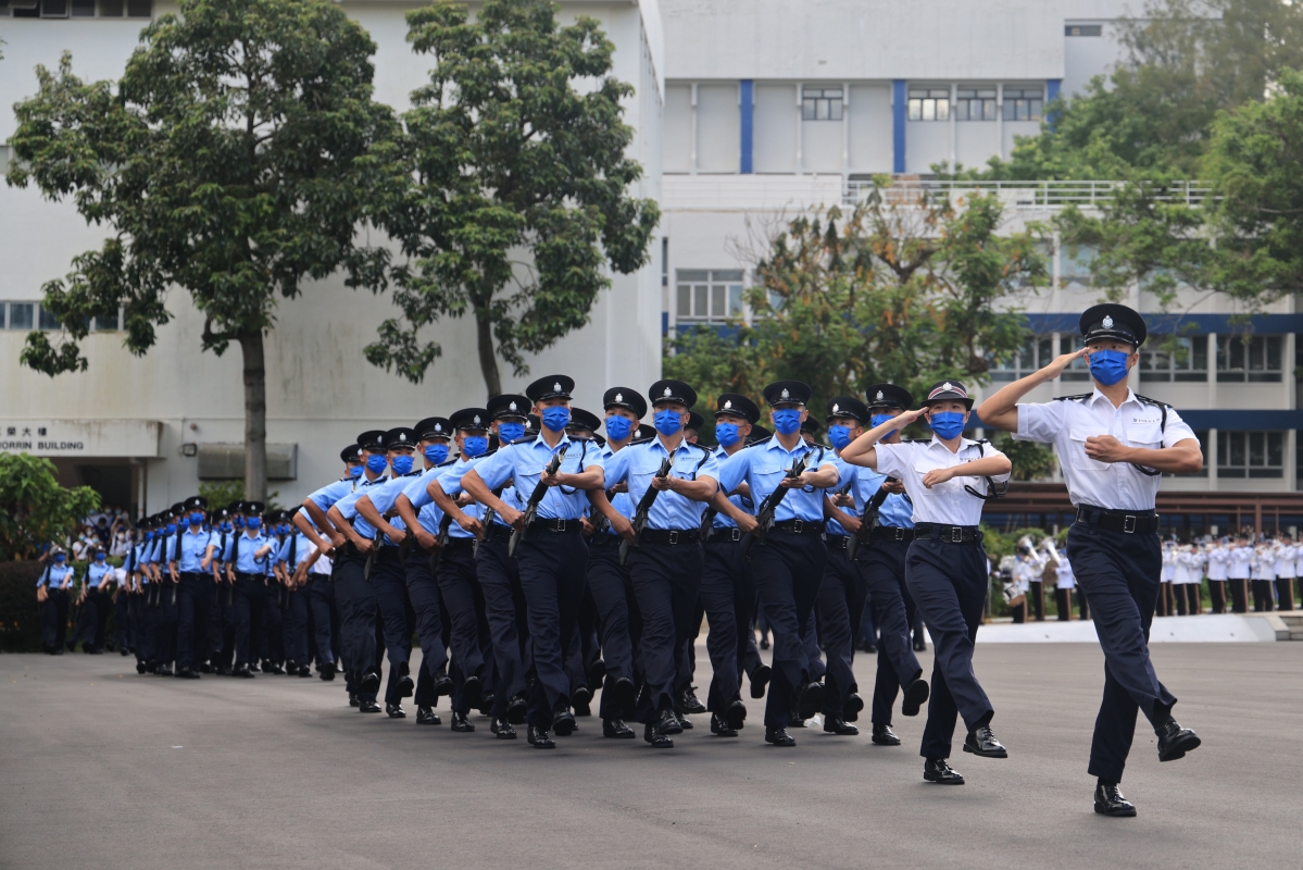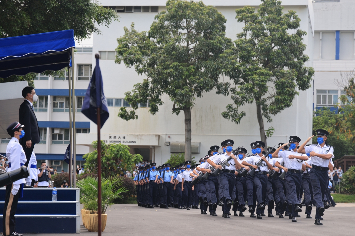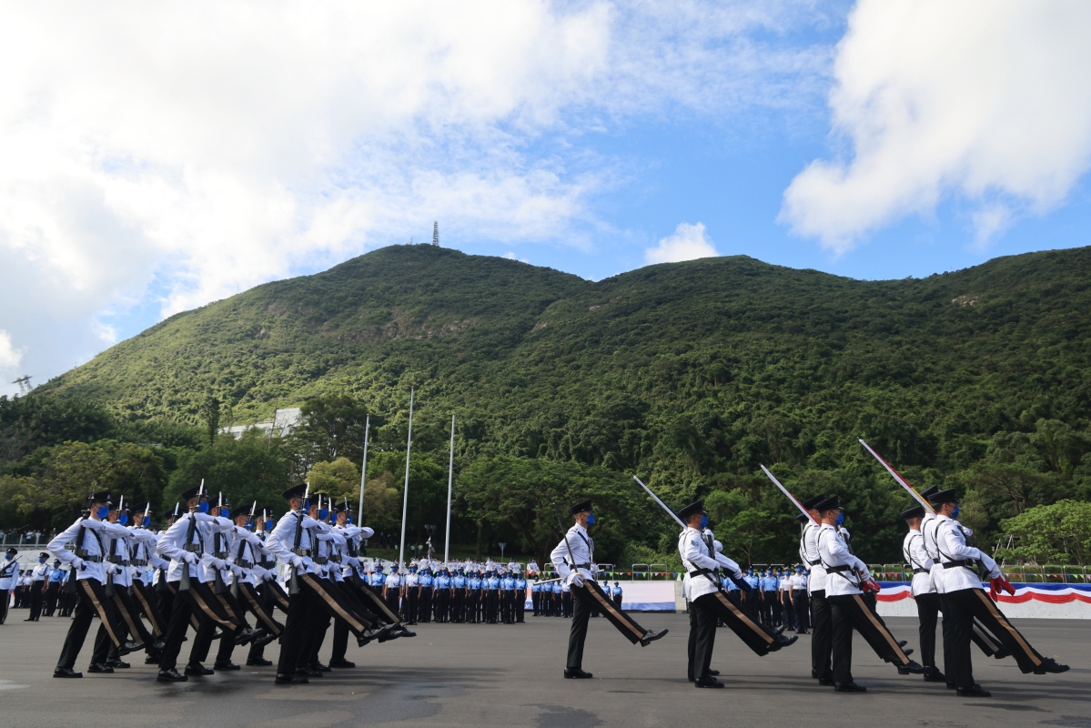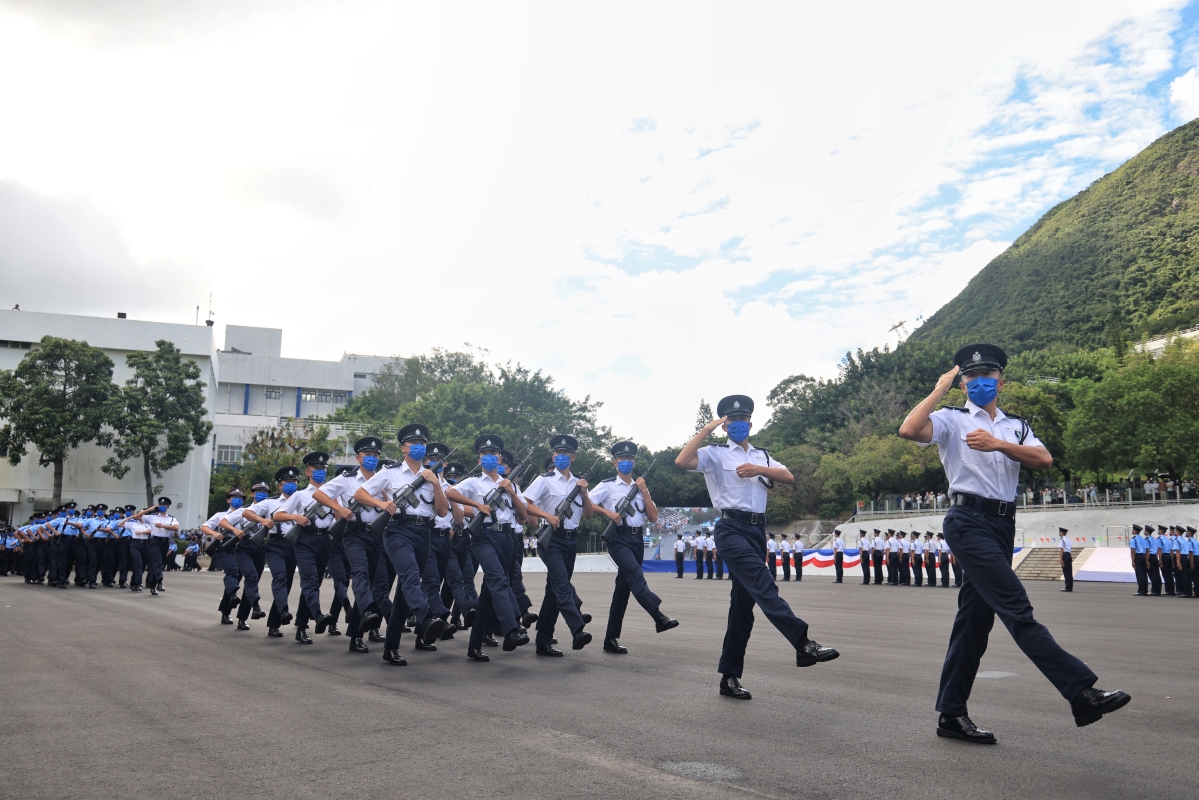 香港新聞網7月9日電(記者 許其皓)7月9日,香港警察學院舉行結業會操,特區行政長官李家超在典禮中檢閱畢業的見習督察和學警。這是香港警察首次以中式步操進行結業會操。會操中,警員眼神自信堅定,邁著鏗鏘有力的正步步伐,擺臂時端平有力,動作流暢整齊。今年是香港回歸祖國25周年,警隊7月1日起全面轉用中式步操,除各典禮儀式及結業會操外,各級人員日常也須遵守敬禮等中式步操禮儀。中式步操和英式步操有着诸多差别,警员須经过数以万计的训练,才能呈现出今日的风貌。