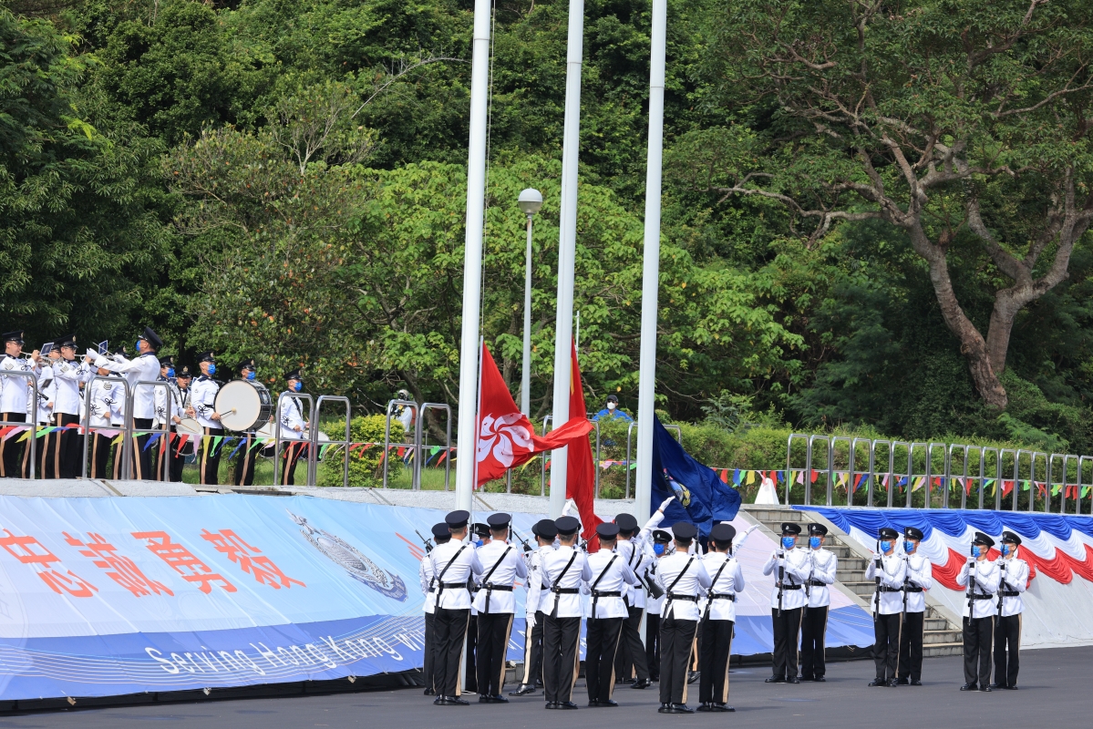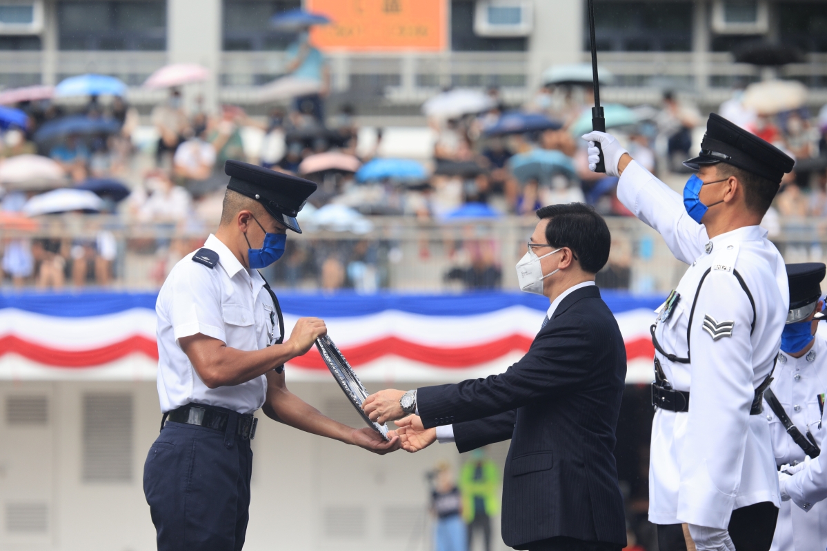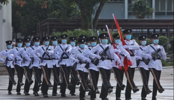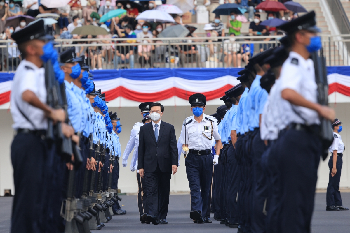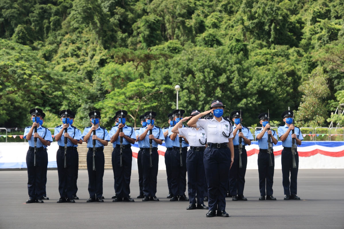 香港新聞網7月9日電(記者 許其皓)7月9日,香港警察學院舉行結業會操,特區行政長官李家超在典禮中檢閱畢業的見習督察和學警。這是香港警察首次以中式步操進行結業會操。會操中,警員眼神自信堅定,邁著鏗鏘有力的正步步伐,擺臂時端平有力,動作流暢整齊。今年是香港回歸祖國25周年,警隊7月1日起全面轉用中式步操,除各典禮儀式及結業會操外,各級人員日常也須遵守敬禮等中式步操禮儀。中式步操和英式步操有着诸多差别,警员須经过数以万计的训练,才能呈现出今日的风貌。