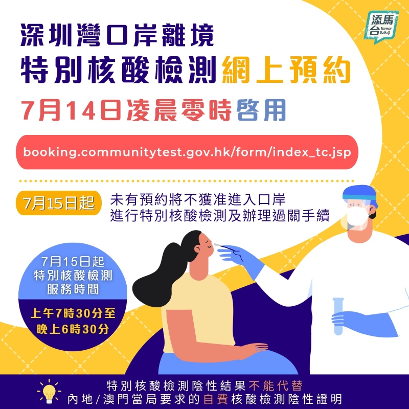 香港新聞網7月14日電 特區政府表示,為紓緩旅客在深圳灣口岸長時間等候的情況,由明日起,經深圳灣離境的旅客必須持有特別核酸檢測預約證明,方可進行有關檢測。預約系統今日(14日)凌晨零時啟用。