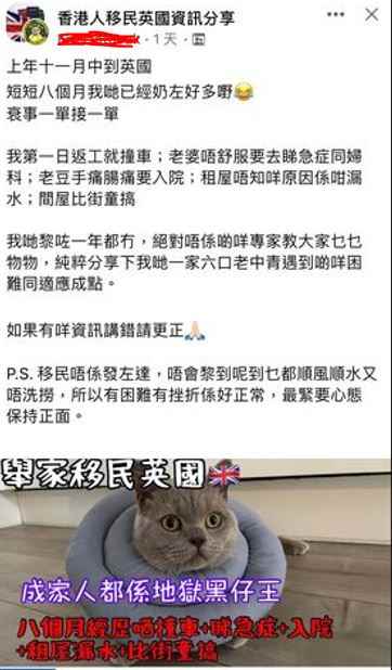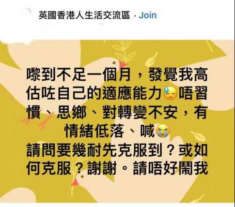 日前,一名移英“黃絲”在臉書專頁“香港人移民英國資訊分享”發帖稱,2021年11月中選擇舉家移民英國,並期待在當地開展新的生活,未料短短八個月時間,“衰事一單接一單”。 有多衰呢?據該名“黃絲”自曝:他自己第一天上班就遭遇撞車事故;老婆身體不舒服,要去看急症和婦科;爸爸手痛腸痛要住院;在當地租的房子有問題,總是漏水,還要被街童(在街上聚集滋事的青少年)搞。 “純粹分享一家六口老中青遇到的困難和適應成怎樣……”似乎擔心這篇貼文會被“同路人”當成“放負”(宣揚負面情緒),該名“黃絲”最後又用極其卑微的姿態喊話:移民不是發達,也不會到了當地就一切順風順水,所以有困難有挫折好正常,最緊要心態保持正面…… 眾所周知,2019年香港“修例風波”期間,“黑暴分子”在香港大肆搗亂,打砸燒搶樣樣皆來,而“黃絲”也是滿口的“齊上齊落”,在一旁為黑暴搖旗吶喊。 2021年年初,英國政府違諾推出所謂BNO“5+1”入籍政策後,不少“黃絲”爭相移民英國,以為外國月亮必比香港圓。 結果,這些“黃絲”很快被現實狠狠打臉,英國當地不僅治安更差,生活成本也更高,最令人難受的,是被當地視為“二等公民”,遭受各種歧視,有人直言“後悔”、“頂不順”,迅速回流香港。 但有人對此卻敢怒不敢言,只能默默忍受,想在網上找“同路人”訴苦,反被教訓應該接受“英國文化”,甚至遭斥是唱衰移英而被刪文。 日前,就有“黃絲”在臉書專頁“英國香港人生活交流區”投稿,直指曾有移英家長批評英國醫療系統不清,然而貼文卻因不中聽、唱衰移民,被該群組“連根拔起”。 這“一言堂”的架勢,難怪有人想要詢問如何更快適應英國生活,都要在最後小心翼翼地加上一句,“請不好鬧我”。