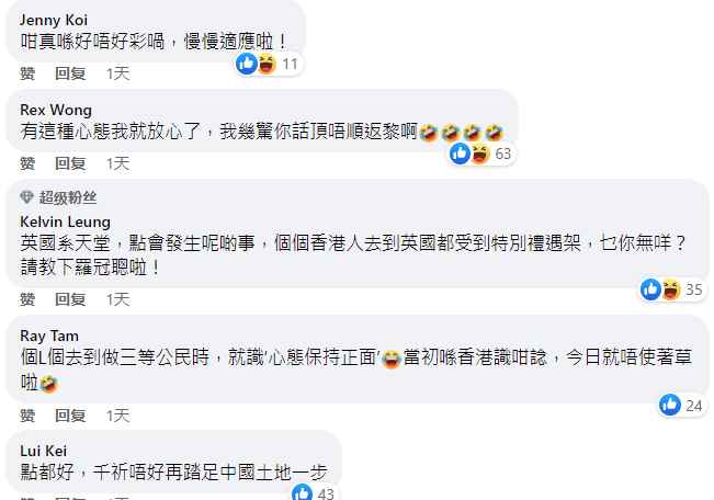 因此,對於有“黃絲”移英後衰事一堆還勸人“心態保持正面”,諸多香港網友實在看不下去了,毫不客氣地紛紛留言駁斥: “為何在香港的時候,不保持心態正面呢?” “去英國做三等公民時,就識‘心態保持正面’,當初在香港懂這麼想,今日就不用著草啦!”