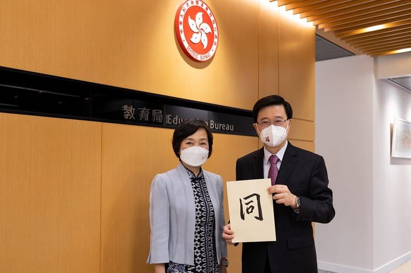 香港特區行政長官李家超將“同”字送給應屆考生。他說,“無論你們未來是繼續升學、就業還是創業,我們都會與你們一起同行。”