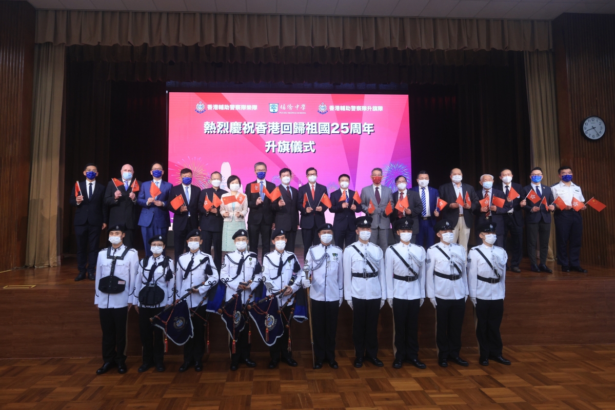香港新聞網7月18日電(記者 許其皓)7月18日早上,香港培僑中學舉行升旗儀式慶祝香港回歸祖國25周年。 在香港輔助警察隊樂隊的奏樂聲中,香港輔助警察隊升旗隊踏著整齊的中式步操步伐入場。 上午8時,全體嘉賓和師生莊嚴肅立,鮮艷的中華人民共和國國旗在莊嚴的國歌聲中冉冉升起。 香港特區政府保安局局長鄧炳強、香港特區政府教育局局長蔡若蓮、香港中聯辦警聯部部長陳楓、香港中聯辦教科部副部長徐凱、香港警務處處長蕭澤頤等出席升旗儀式。