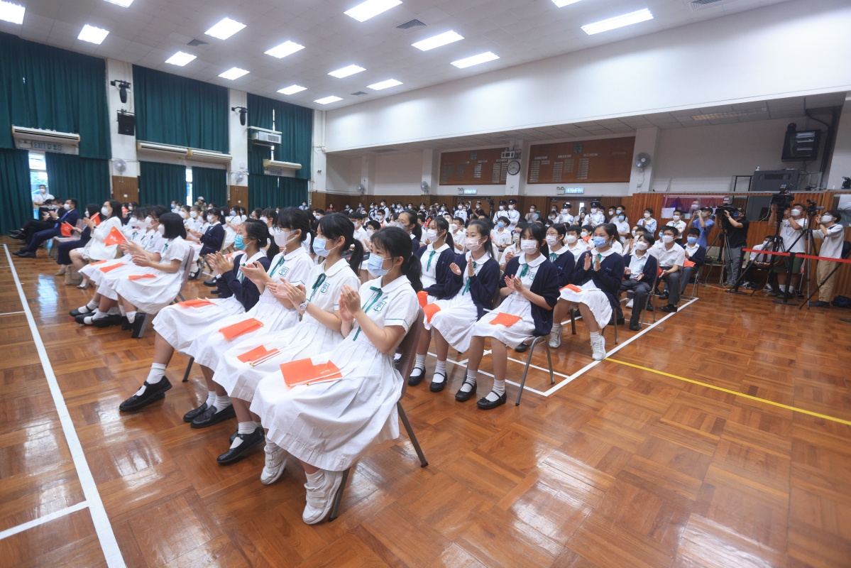 全場嘉賓和師生手舉中華人民共和國國旗和香港特區區旗合照。