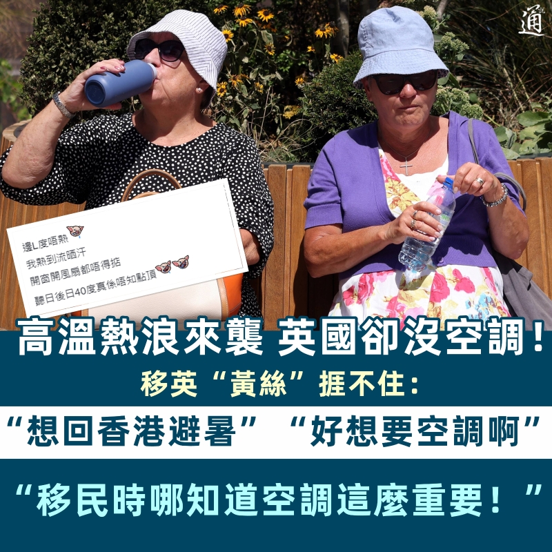 在港時,他們幾乎一年四季離不了空調,來英國後莫非只能靠意志力降溫?此情此景令不少移英“黃絲”直呼承受不來! 有“黃絲”在香港“連登”討論區發帖吐槽稱,在香港時以為英國不熱,怎知“一起床已經熱到想吐”,哀歎來英國“中伏(踩坑)”了,“開窗開風扇都不頂用,明後天40℃,真不知道怎麼辦!”