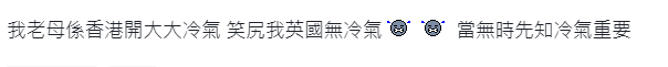 “好想要冷氣(空調)。”該移英“黃絲”哀怨地說。 不少移英“同路人”顯然都對此感同身受。有人直言“想回香港避暑”,亦有“黃絲”“心酸”地表示自己的媽媽在香港開空調避暑,笑他在英國沒空調用。該“黃絲”哭訴,離港前“哪知道空調這麼重要”。