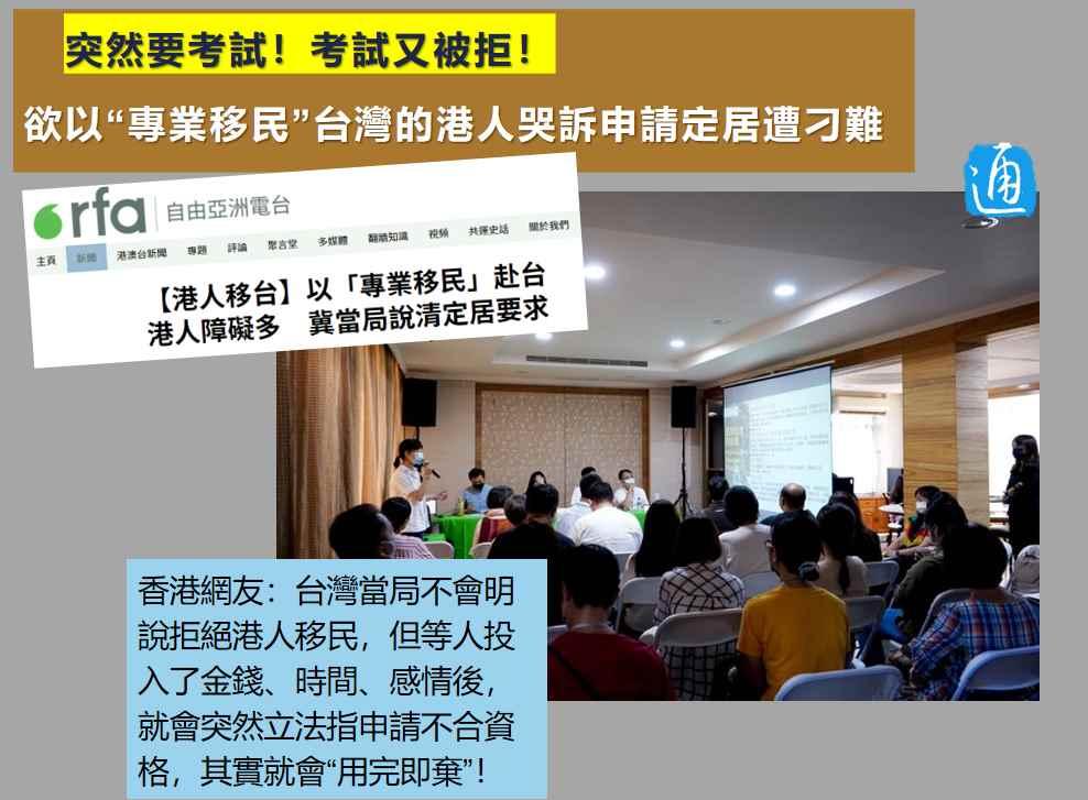 據報道,近日,台灣高雄市政府舉辦“港人生活座談會”,會上不少港人抱怨申請在台定居受阻,尤其是打算通過“專業移民”方式赴台,申請時才突然被告知不符合一些新的附加條款,希望台灣當局能清楚說明申請定居要求。 有港人表示,剛開始想要申請“專業移民”時,台灣當局並沒有提出要重考執照或需要工作,只列明居住滿一年便可申請定居。 然而,當去申請定居時,卻突然被告知要考試和提供在台工作證明,才考慮審批。 問題是,他們去報名考試被拒絕,因為取得的學歷不符台灣要求,而沒有考獲執照便不能從事相關的專業工作。 想找其他工作,又沒有台灣身份證。即使能從事相關工作,受聘門檻也很高。 因為,依據台灣規定,外籍人士在台工作,僱主應符合以下條件:營業額達新台幣1000萬以上,以最低薪金雙倍給薪。 與會的港人“王小姐”形容,“現在就卡在中間,想向前走又走不到,兩邊好像也死路一條。” 她吐槽稱,台灣當局批准香港專業人才來台就業,即是認可對方的證書和學歷,但來到後又不讓考試、找工作,“好奇怪”。 離譜的是,面對港人提出的訴求,在“修例風波”期間不停蹭香港熱度的台灣當局,竟稱在“專業移民”方面,沒有很明確的法規規定要怎麼樣才能定居,規範也是“定居科”去做,當初的立法原意是希望吸引專業人才來台幫助台灣就業。這是,把人騙過來再說? 事實上,台灣當局自2020年初就不斷收緊港人移台政策,居留、定居審查也越趨嚴苛,例如有大陸出生背景,或曾任職港府公務機關,基本上全部駁回,令不少港人要“二度移民”、“二度流亡”。 有台媒曾報道,一位以“專業移民”來台的女性港人,在台灣居留1年後申請定居,結果半年沒下文,質疑因曾在香港醫管局任職護士,而遭台灣當局“故意拖延”。 这位女性港人表示,自己已經努力融入台灣生活,但沒有盡頭的等待,讓她心生退意,坦言可能會回香港,然後與丈夫移民英國。 因此,對於港人哭訴申請“專業移民”被刁難,香港網友紛紛留言表示,台灣當局不會明說拒絕港人移民,但等人投入了金錢、時間、感情後,就會突然立法指申請不合資格,說的好聽是新的附加條款,其實就是設門檻卡人,提醒那些還以為台灣當局會兌現援港承諾的港人:台灣當局擺明是用完即棄!