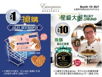 大會亦與直播平台LOOPLIVE合作,新增“睇直播,買‘正’貨”活動,邀請KOL於展前及展覽期間以LOOPLIVE應用程式作直播,介紹特色產品並提供多項購物優惠,大家想以最划算的價格買到心頭好,便要密切留意直播資訊! 今年美食博覽的優惠當然不止如此,展會期間每天會舉行“多買多賞幸運大抽獎”,只要憑單一收據消費滿港幣200元即可參與抽獎一次,每張收據上限抽獎五次。豐富獎品包括五星級酒店住宿套票、護膚產品、各式美食及健康用品等。另外,大會繼續推出“8月食.住.買”網頁,讓大眾緊貼最新的購物消息及各種快閃優惠,包括港幣一元的雞煲、鮑魚麵禮盒、榴槤冰皮月餅等,大家可預先下載電子優惠券,盡享各項精彩優惠! 其他快閃優惠包括︰
