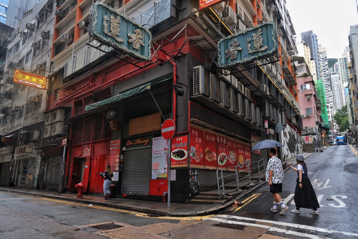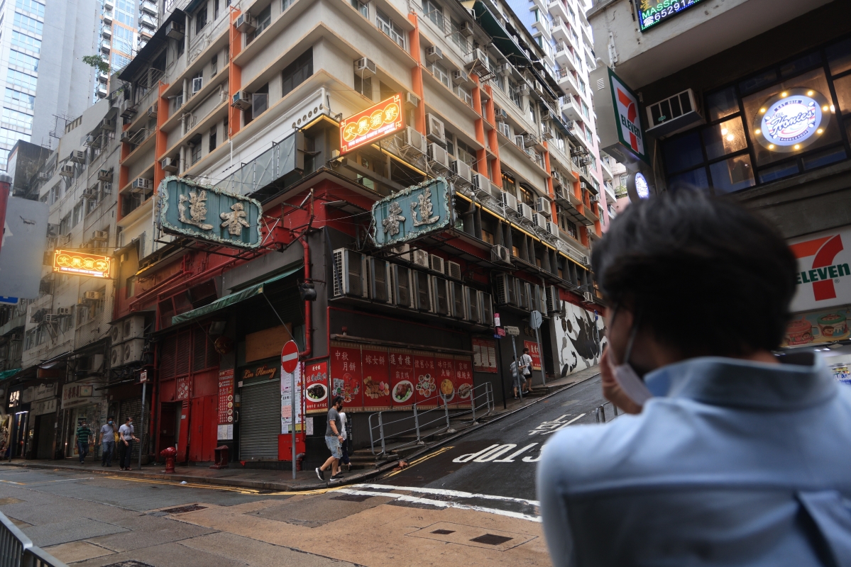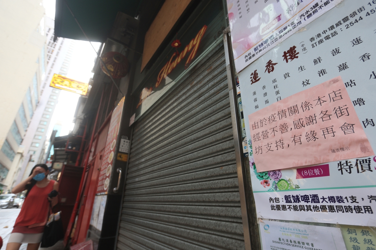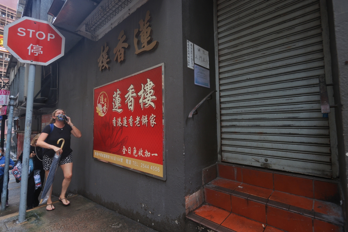 市民經過關門結業的蓮香樓 當日凌晨,香港蓮香飲食集團宣佈,旗下特許經營加盟商蓮香樓及蓮香棧因為疫情原因,已於8月8日正式結束營業。