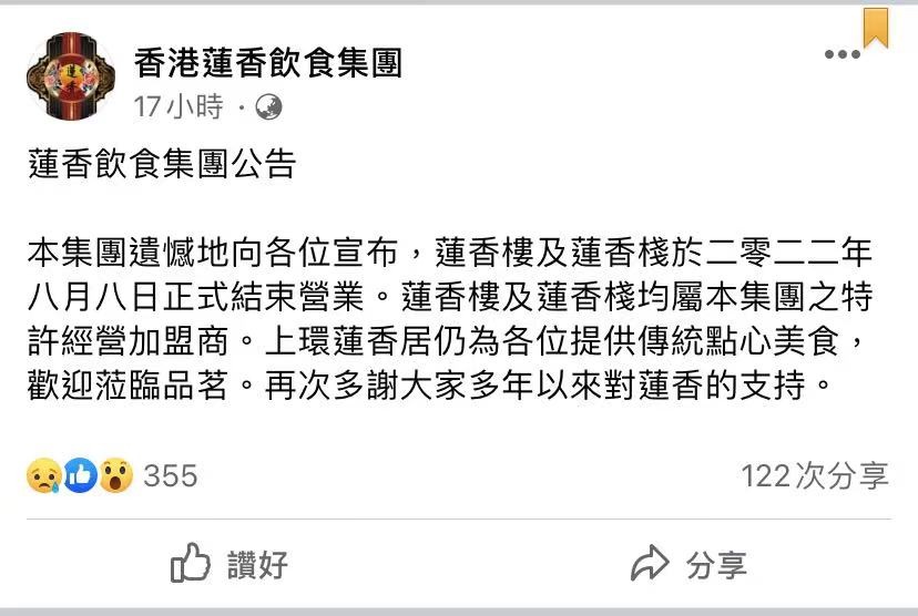 香港蓮香飲食集團凌晨宣布蓮香樓結業 蓮香樓於1889年開業,原名“連香樓”,前身是廣州西關的婚慶餅店糕酥館,後因蓮蓉製作出色,獲翰林學士陳如岳讚賞,易名為“蓮香樓”,香港分店於1918年開設。2019年2月,因租約期滿等問題,蓮香樓一度休業整頓,後來幾名老員工接手,以特許經營模式接手營運,易名“蓮香茶室”,後遇上修例風波和疫情無法繼續經營。2020年,蓮香樓東主顏氏第四代傳人決定再次接管酒樓,並再次正名為“蓮香樓”。