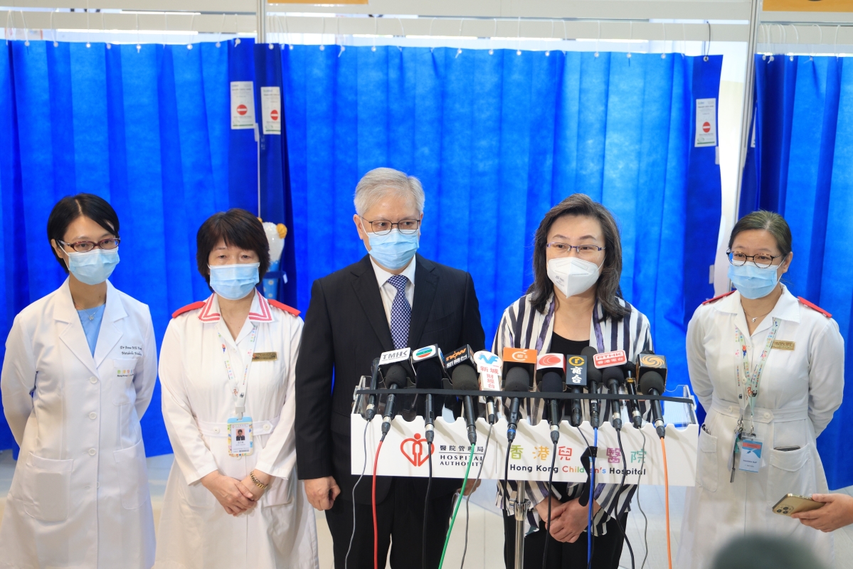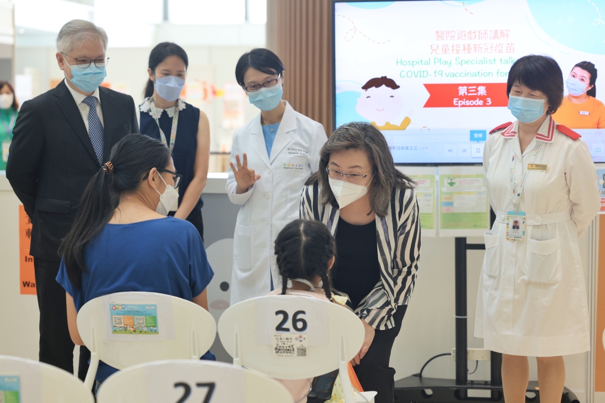 兒童醫院有專業人員協助小朋友打針 香港特區政府公務員事務局局長楊何蓓茵當日上午到香港兒童醫院兒童社區疫苗接種中心視察後表示,兒童醫院疫苗接種服務過程順暢,目前約有3000名嬰幼兒接種新冠疫苗,還會調低到校接種的門檻,由30人減至10人,希望人數較少的幼稚園可以使用服務。