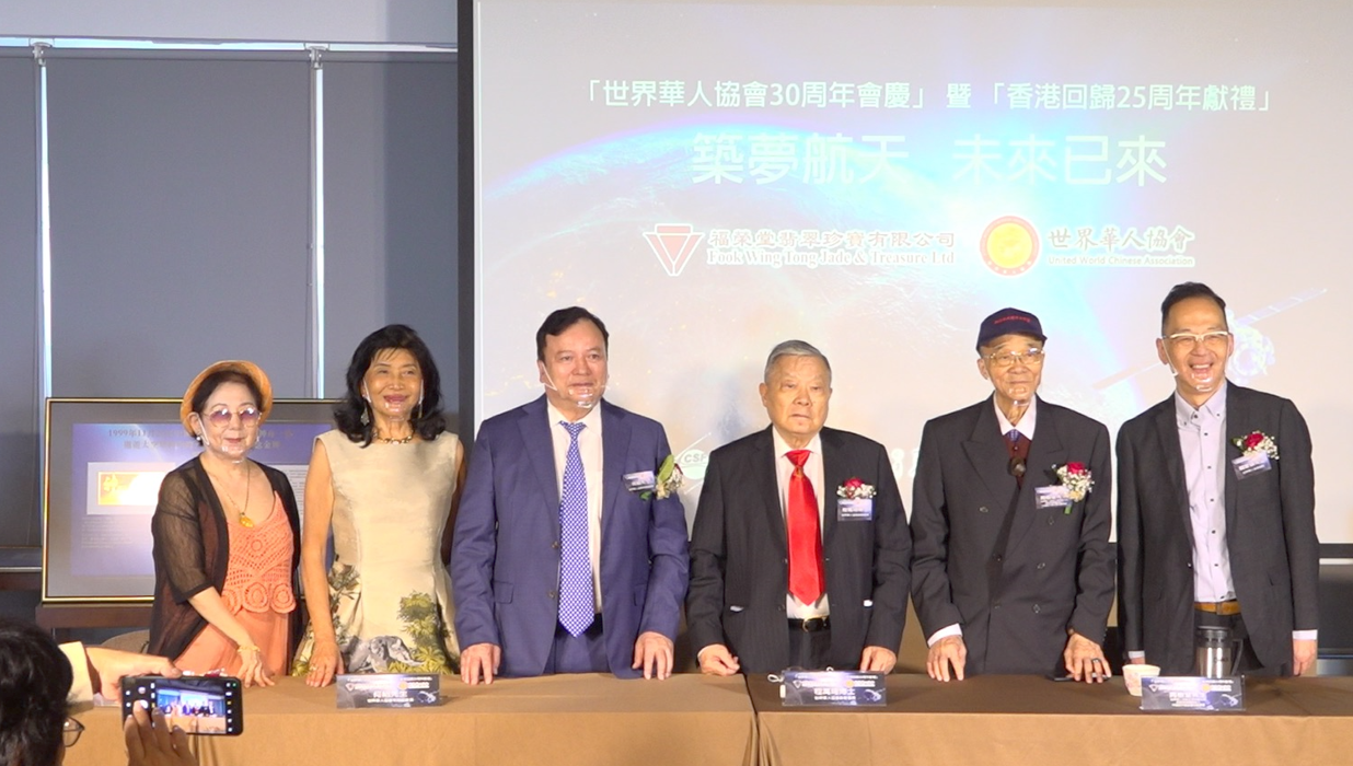 世界華人協會永遠榮譽主席周樹堂(右二)、世界華人協會會長程萬琦(左四)、慈善家趙曾學韞女士(左二)、世界華人協會常務會長何昭(左三)等嘉賓出席記者會。 在當日的記者會上,世界華人協會會長程萬琦回顧了協會的成就,成立30年來,協會團結了世界各地的華人,現今會員數目已達600萬,遍佈180多個國家和地區。今年協會繼續凝聚華人力量,弘揚中華文明,將在11月4日舉行30周年會慶拍賣活動,拍賣所得收入將捐贈支持中國航天基金、航天科技的研究和發展,培養更多航天人才及宣傳中國航天事業。 拍賣活動雲集不少稀世珍藏品,有“沉香大王”之稱的福榮堂集團創辦人周樹堂將捐出大批福榮堂珍貴沉香藏品,以及“神州一號”太空船紀念品。 福榮堂集團創辦人兼中國航天基金會名譽理事周樹堂說,“神舟一號”飛船是中國載人航天計劃中發射的第一艘實驗飛船,具有極高的歷史意義。他希望,透過拍賣“神州一號”太空船藏品,宣傳中國航天事業,支持航天科技發展。 除此之外,“阿呼齋”頂級陶瓷、著名畫家張大千、齊白石、徐悲鴻和傅抱石的名貴字畫等也將在拍賣會中亮相。 世界華人協會亦將舉辦“中國航天事業推廣大使計劃”,邀請200名有志者,擔任航天推廣大使,為期一年,肩負航天教育使命,到香港中小學推廣中國航天事業成就,並舉辦“中國年青太空人計劃”,提高香港青少年對中國航天的認識。 當日公佈了部份“中國航天事業推廣大使”受邀名單,包括偉祿集團創辦人兼主席林曉輝、偉祿集團執行董事馬超等。 (完) 【編輯:徐嘉儀】