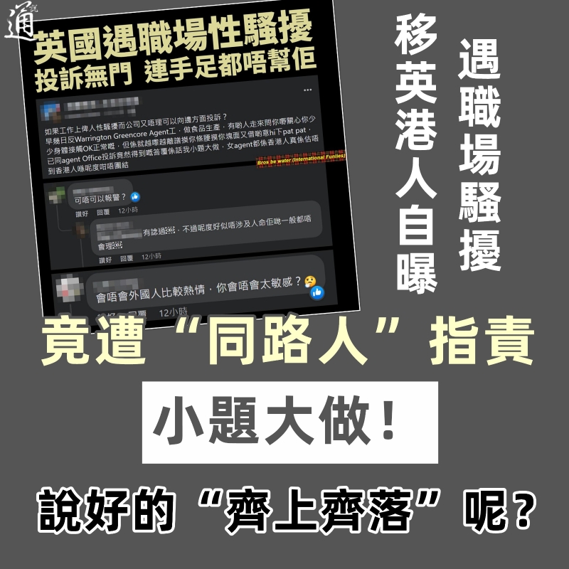 香港新聞網8月19日電 在香港耀武揚威的“黃絲”一到英國就成了紙老虎?哪怕有“同路人”自曝遭遇職場性騷擾,他們亦望“息事寧人”,稱西方人本就比較熱情,認為投訴者或在小題大做。 近日,一位移英港人發帖求助,詢問若是遭遇職場性騷擾,但公司毫無作為,應該向何處投訴? 事主自述就職於英國一家食品生產公司,稱自己在工作時,有同事過來閒聊,期間有些許肢體接觸。她開始覺得這很正常,但該同事後來越發離譜,開始摸腰、摸臉甚至假裝不經意地摸隱私部位。 至於為何不向英國警方求助,事主坦言有想過,但認為在英國除了人命關天的事,其它的英警好像都不會處理…… 事主於網絡發文本想獲得幫助,未料,其他移英港人的想法亦與領導一致。有人指事主太敏感,聲稱“西方人本來就比較熱情!”