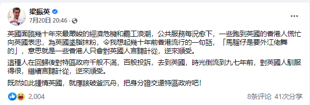 在香港時眼中容不下一粒沙,來到英國遇上性騷擾這麼嚴重的事,不刨根問底,就忙著指責“自己人”小題大做,“黃絲”們雙標至極、甘當英國“二等公民”的嘴臉讓得悉消息的香港網友忍不住出聲嘲諷:“說好的齊上齊落呢?” 還有網友吐槽“黃絲”整日吹噓西方的“民主自由”,但真來到西方竟如此怕事,只敢對“同路人”重拳出擊,“ ‘自由’就是這樣?” 前段時間英國遭遇極端高溫,但因空調普及度不高,英國民眾苦不堪言。然而,不少移英港人卻慌忙“洗地”稱“其實沒那麼熱”“香港更熱,又濕又熱!” 此外,英國正面臨幾十年來最嚴峻的經濟危機和罷工浪潮,通脹指數攀升,民眾節衣縮食度日。一些移英港人又為英國塗脂抹粉,稱物價沒那麼高。 香港前特首梁振英曾就此類現象發文諷刺:“這令我想起幾十年前香港流行的一句話,‘馬騮仔是要外江佬舞的’,意思就是一些香港人只會對英國人言聽計從,逆來順受。” 梁振英說,這種人在回歸後對特區政府千般不滿,百般投訴,來到英國卻服從得很,一瞬間回到97年以前,繼續對英國人言聽計從,逆來順受。