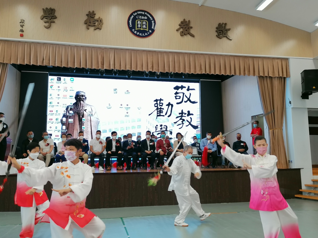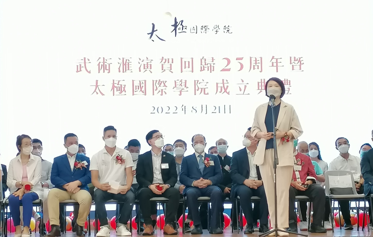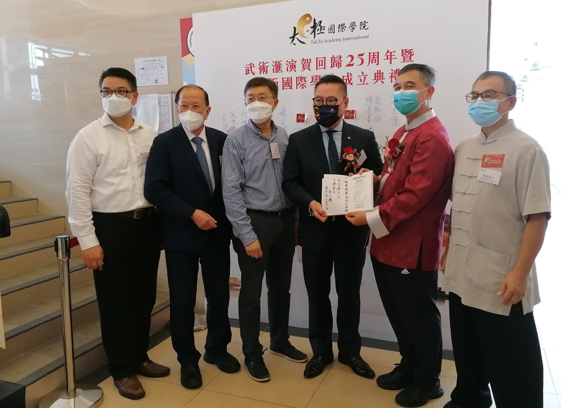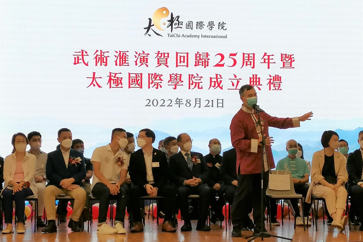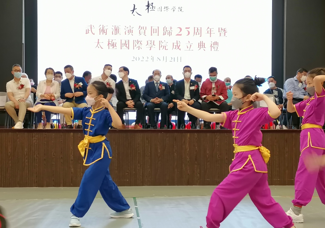 香港新聞網8月21日電 (記者洪少葵)香港太極國際學院暨香港氣功太極社主辦之《武術匯演賀回歸25周年暨太極國際學院成立典禮》21日在黃大仙孔教學院大成小學禮堂舉行,同日晚上舉行之《 太極國際學院成立暨香港氣功太極社廿二周年聯歡晚會 》。來自香港各界太極拳及武林高手到場展演精湛武藝,現場熱鬧騰騰。“太極”是博大精深的中華文化,源遠流長,歷久猶新,不只是運動,也是哲學、科學、藝術和醫學。 太極國際學院主席林文輝、總監貝鈞奇、名譽會長李慧琼女士及一眾資深研究及修習“太極”人士、學者,有志綜合各方力量,以非牟利機構註册成立《太極國際學院》,以期善用香港優勢,以專業、專科建立“太極”的學術及應用系統,包括文哲科藝、醫療養生,及相關福利工作,弘揚 “太極”文化,更造福社會外讓更多的武術學好者及民眾關注中華武術,進一步推向國際。太極國際學院主席林文輝介紹,太極國際學院倡議透過太極體驗中華文化,提昇香港人的愛國心,訂立三大目標,讓市民認識多功能的“太極8識”,倡訂11月12日為“全港中華文化太極拳體驗日”,制定“太極競技比賽規則解決套路式比賽結果爭議”。多層次及多方位吸引社會各界人士的關注。