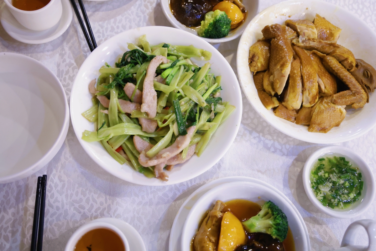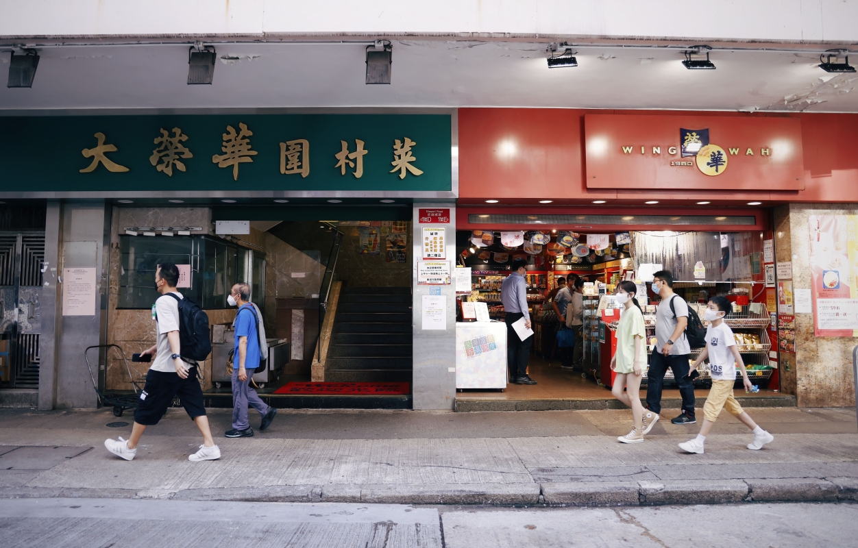 圍村菜菜品多樣。 灣仔大榮華的堂食設於二樓。結業在即,下午5時30分,已有不少市民排隊取票等待叫號,接近7時,隊伍已經從二樓入口順著樓梯排到地面。一壺茶,一份報紙,三兩點心,氤氳著茶樓光景,但傳統中式酒樓終究難敵經濟的不景氣,中式餐館2020年與2019年相比總收益以數量計下跌38.8%,梁文韜看來,灣仔大榮華失去大量遊客後,只靠茶市和午市的市民支持,很難經營下去。