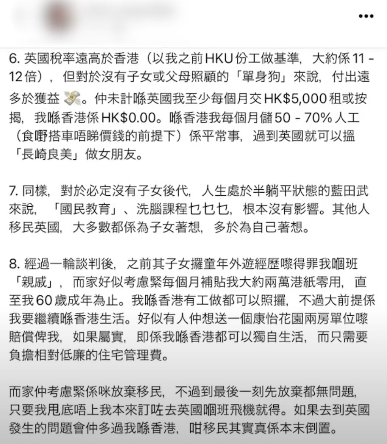 此外,他還抱怨英國稅率遠高於香港,以自己目前的薪水為基準,在英國要繳納的稅款大概是香港的11至12倍。 或許是有了歐洲旅行的經歷,曾經的美好濾鏡破滅後,該“黃絲”直言,歐洲消費高、鐵路服務欠穩定、罪案率頻發,“去旅行一兩次覺得威風,一直去就容易玩厭。” 雖然字裡行間聲稱仍在考慮是否放棄移民,但該“黃絲”明顯已打起退堂鼓,羅列英國的多宗罪後,更總結稱,如果移英後發現問題比在香港多,那麼移民真的是本末倒置。 有網友看後評論稱,那些因衝動跟風想移民的人,不如考慮清楚再做決定,畢竟這個世界沒有後悔藥。 也有網友認為,一些香港人移民,其實變相增加了留港人士的升職機會,待疫情一過,香港與各地區“通關”後只會變好,有腦子的人都不會走! 【編輯:張琦】