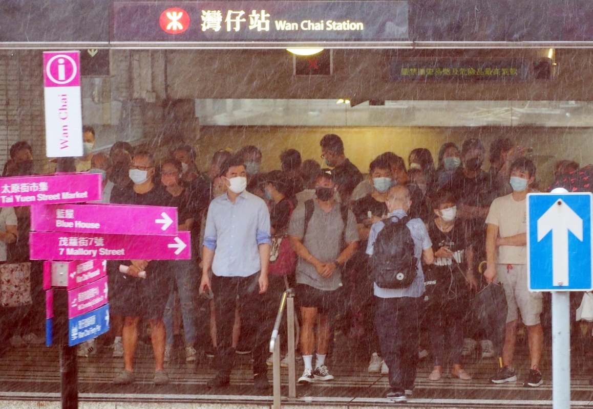 熱帶風暴“馬鞍”遠去,大批市民冒雨趕路,地鐵擁擠。