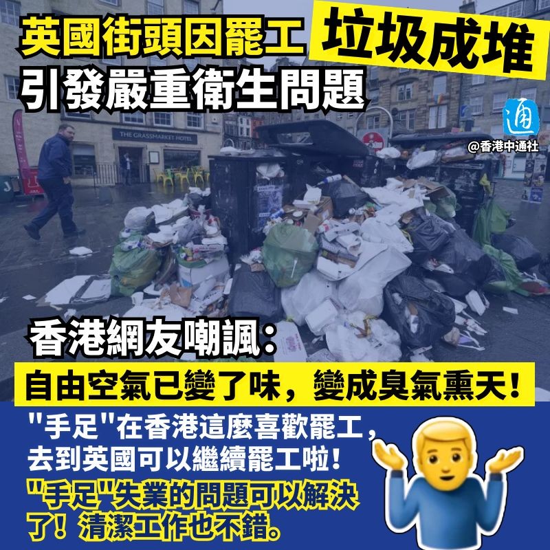 香港中通社製圖 有當地市民抱怨:“這事兒實在太尷尬了,有些遊客不知道罷工的事,他們會以為我們蘇格蘭人日常就是這麼生活……真是丟人。” 蘇格蘭公共衛生部警告,腐爛的食物、動物的排洩物等垃圾堆積起來,很有可能引發衛生危機, 威脅民眾健康。 此外,倫敦東部約130名清潔工同樣不滿地方政府提出的加薪幅度,27日發動罷工一周行動,工會指如果與當局談判破裂,不排除有進一步行動。 眼看曾經的“精神家園”,變成被“垃圾山”包圍的“第三世界”,移英“黃絲”傻眼了! 有網友調侃:“自由空氣已變了味,變成臭氣熏天!”揶揄香港“黃絲”身在福中不知福,以為移英後就能享受所謂“民主自由”,結果卻被現實狠狠打臉!