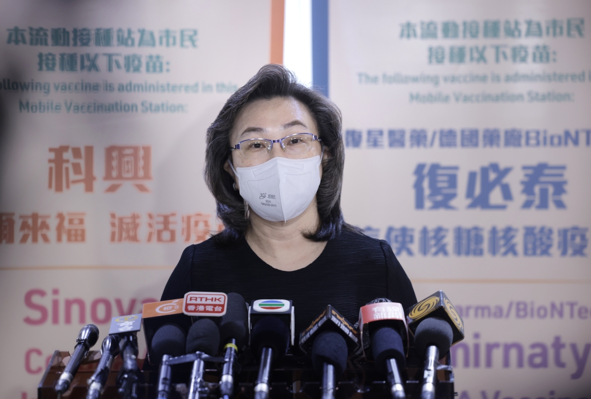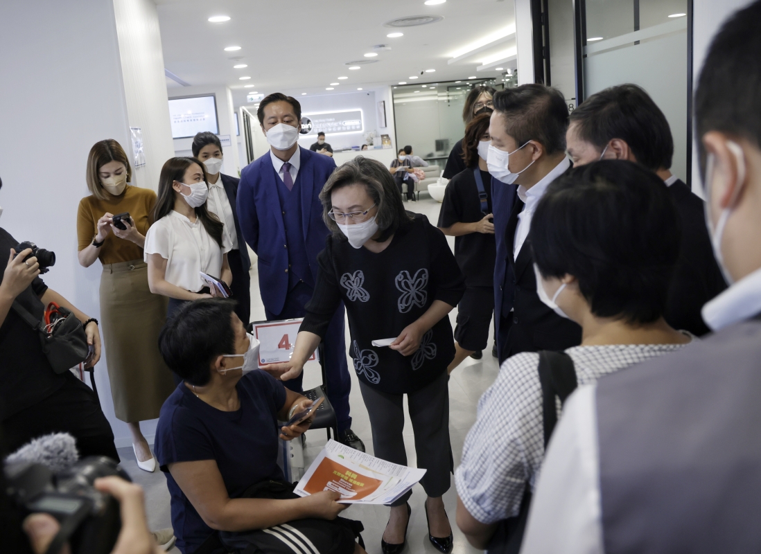 香港公務員事務局局長楊何蓓茵與接種疫苗的市民交流。