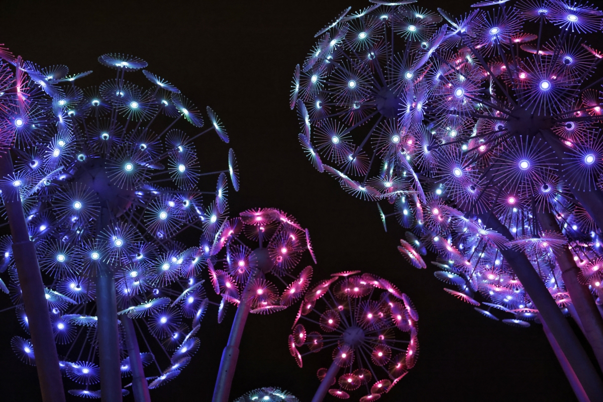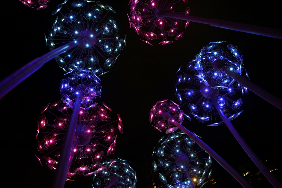 夜幕降臨,裝置由蒲公英幻化為煙花爆破的瞬間。