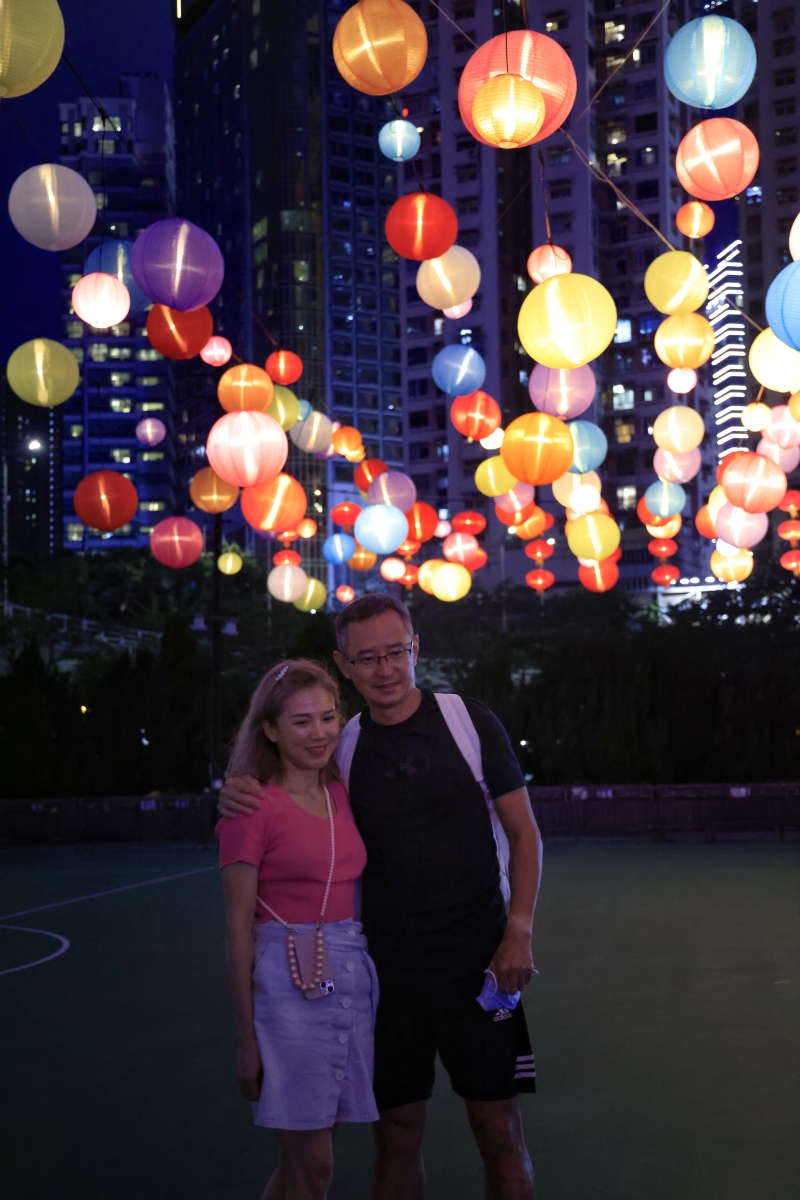 市民在燈球下合影。