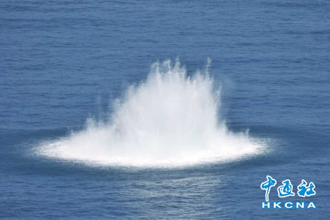 9月9日下午約1時10分,香港警方在鶴咀東北對開海面,成功引爆具有70年歷史的二戰時期英軍軍事級別水雷。香港中通社記者謝光磊攝