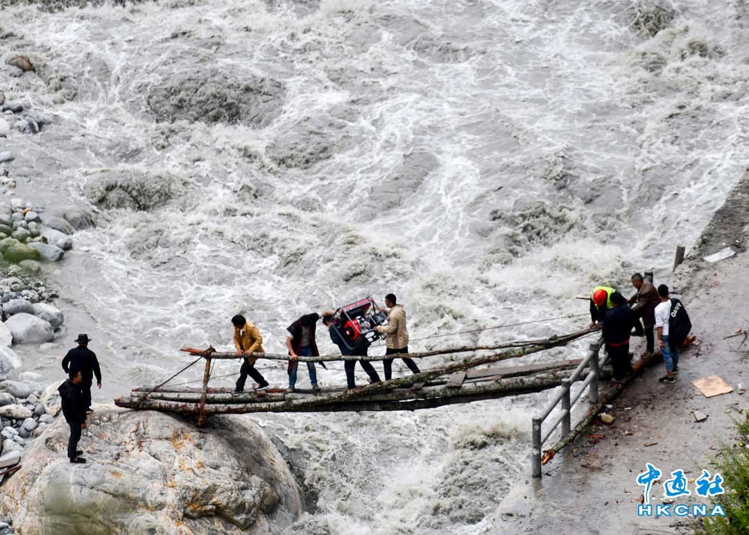 9月9日,四川瀘定磨西鎮青崗坪村磨子河畔,附近村民合力將一台發電機接運回村內臨時安置點。圖為村民背著發電機過簡易木橋。香港中通社圖片