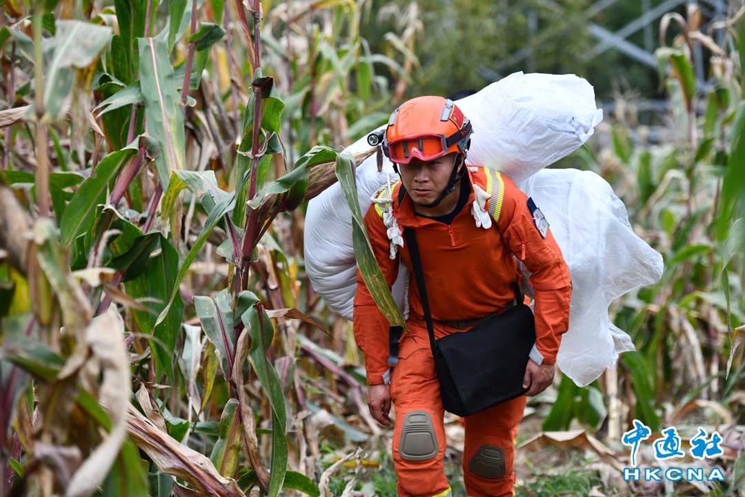9月7日,救援人員徒步運送救災帳篷等物資。當日,甘孜州森林消防支隊70名消防員運送28頂救災帳篷至四川甘孜藏族自治州瀘定縣磨西鎮磨崗嶺村。受地震影響,磨崗嶺村通往外界唯一的道路中斷,救援人員通過徒步方式、翻山越嶺運送帳篷,村民也在途中利用騾馬、摩托車等接力傳遞救災物資。香港中通社圖片