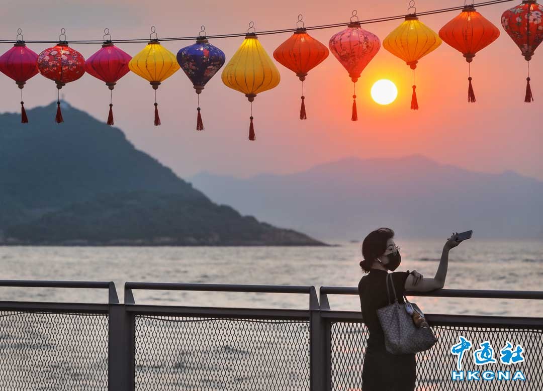 香港卑路乍灣海濱長廊是西環熱門的日落打卡景觀。適逢中秋佳節臨近,海濱長廊掛上多個色彩繽紛的傳統燈籠。圖為9月5日黃昏時分,日落的餘光照射大海,映照剛剛亮起的燈籠,畫面浪漫唯美,吸引不少香港市民打卡拍照。香港中通社記者謝光磊攝