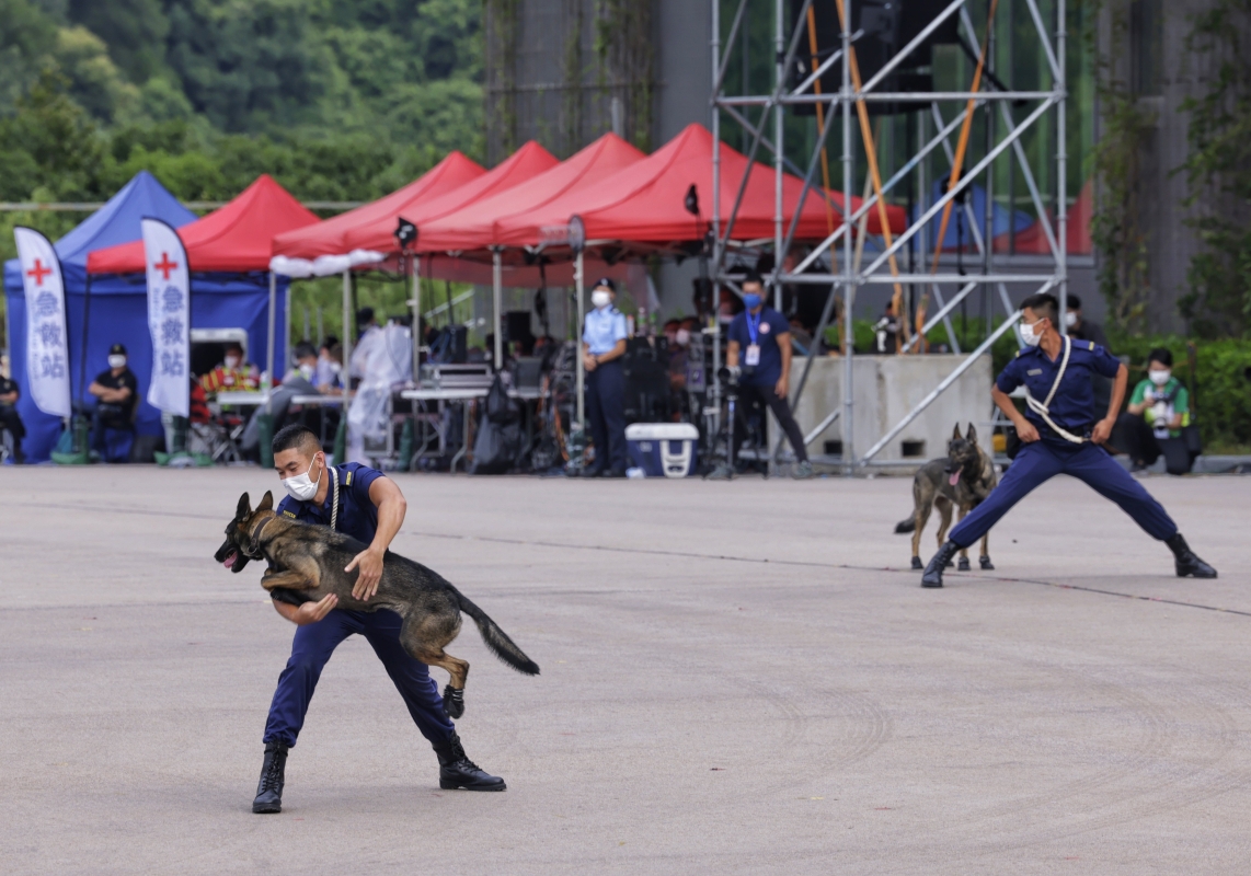 紀律部隊的領犬員與工作犬作執法示範表演。