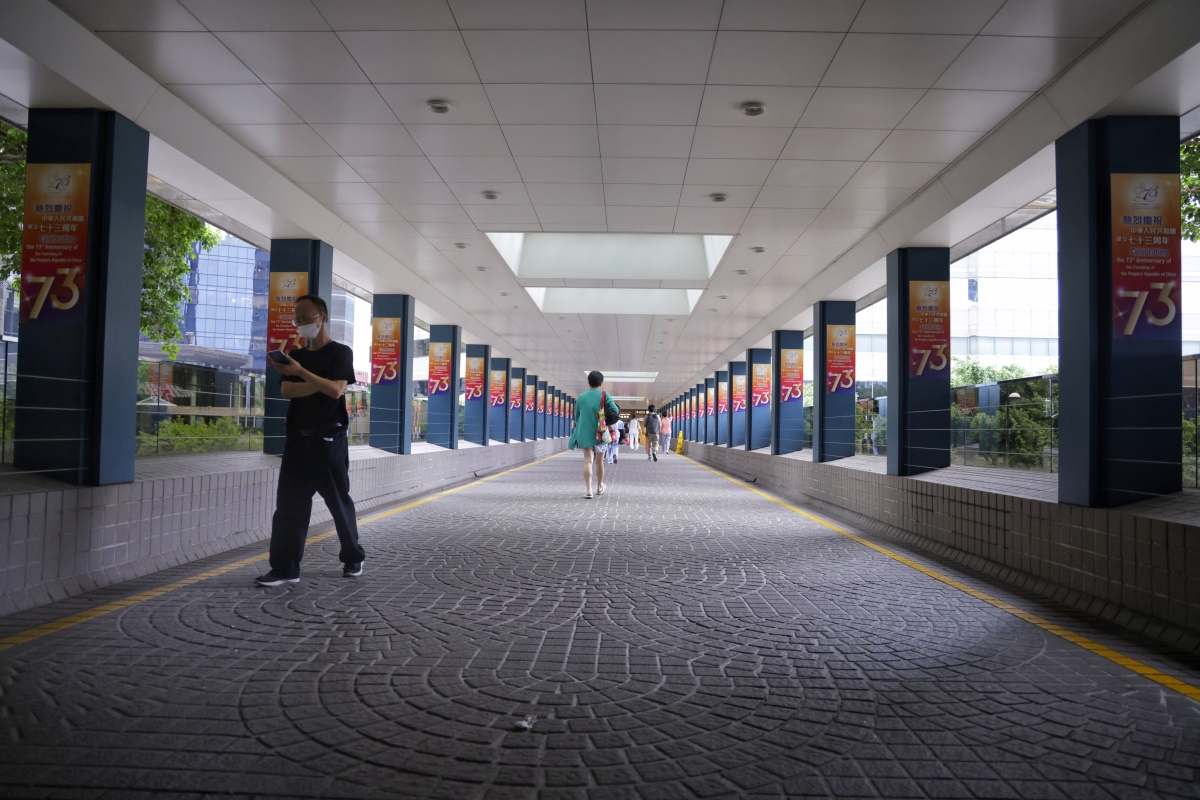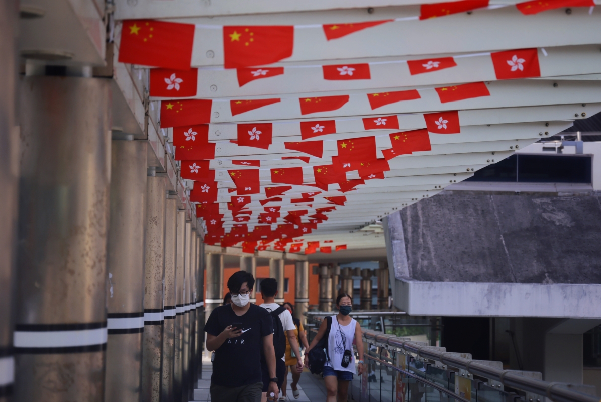 香港新聞網9月30日電(記者 曹文毓)國慶將至,香港大街小巷熱鬧非凡。城市中,各區遍佈紅旗、彩旗、橫幅、標語,以中國紅為主色調的同時,亦有色彩斑斕的裝飾相襯,熱烈慶祝中華人民共和國成立73周年。行走街頭,滿眼“中國紅”,不少市民爭相打卡,氣氛一片祥和。