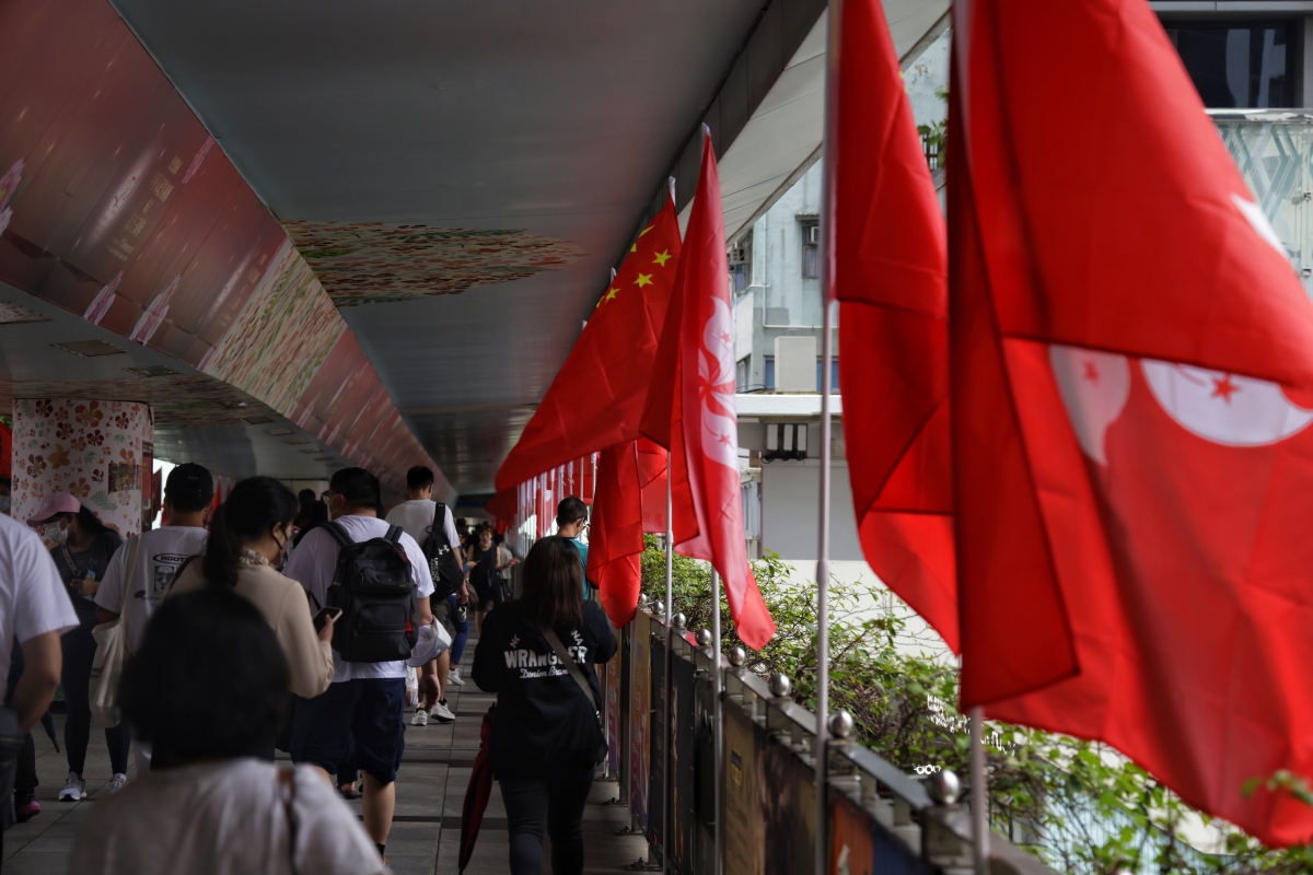 黃竹坑行人天橋懸掛眾多紅旗和彩色橫幅。