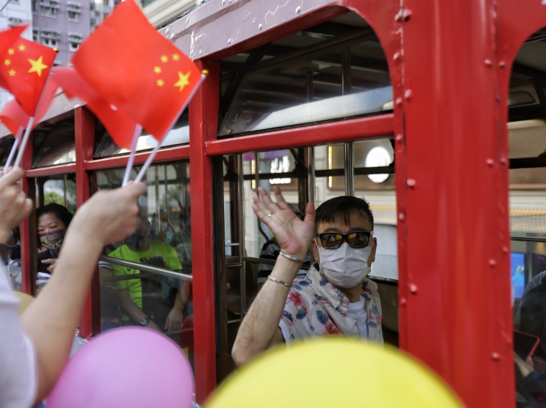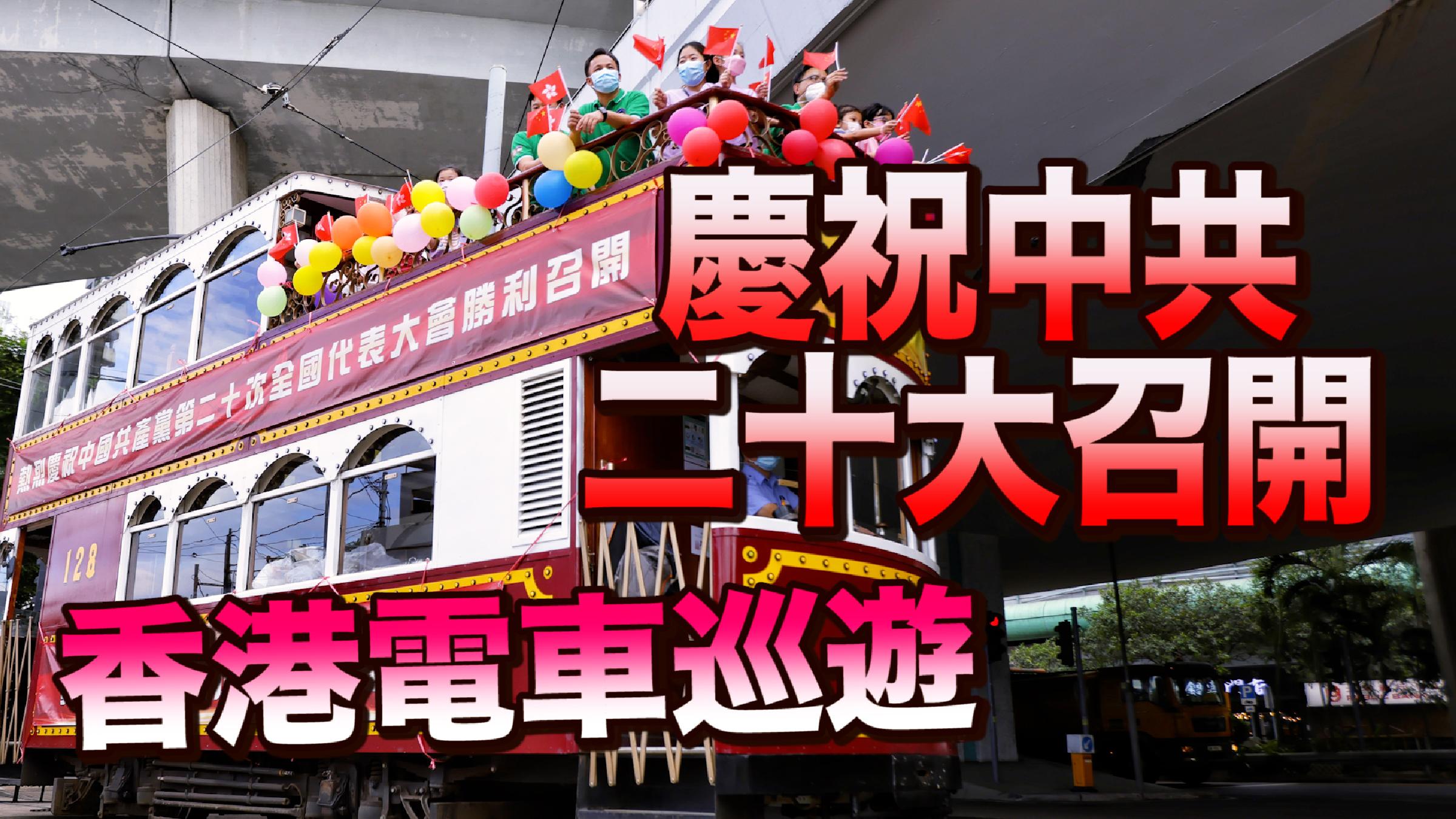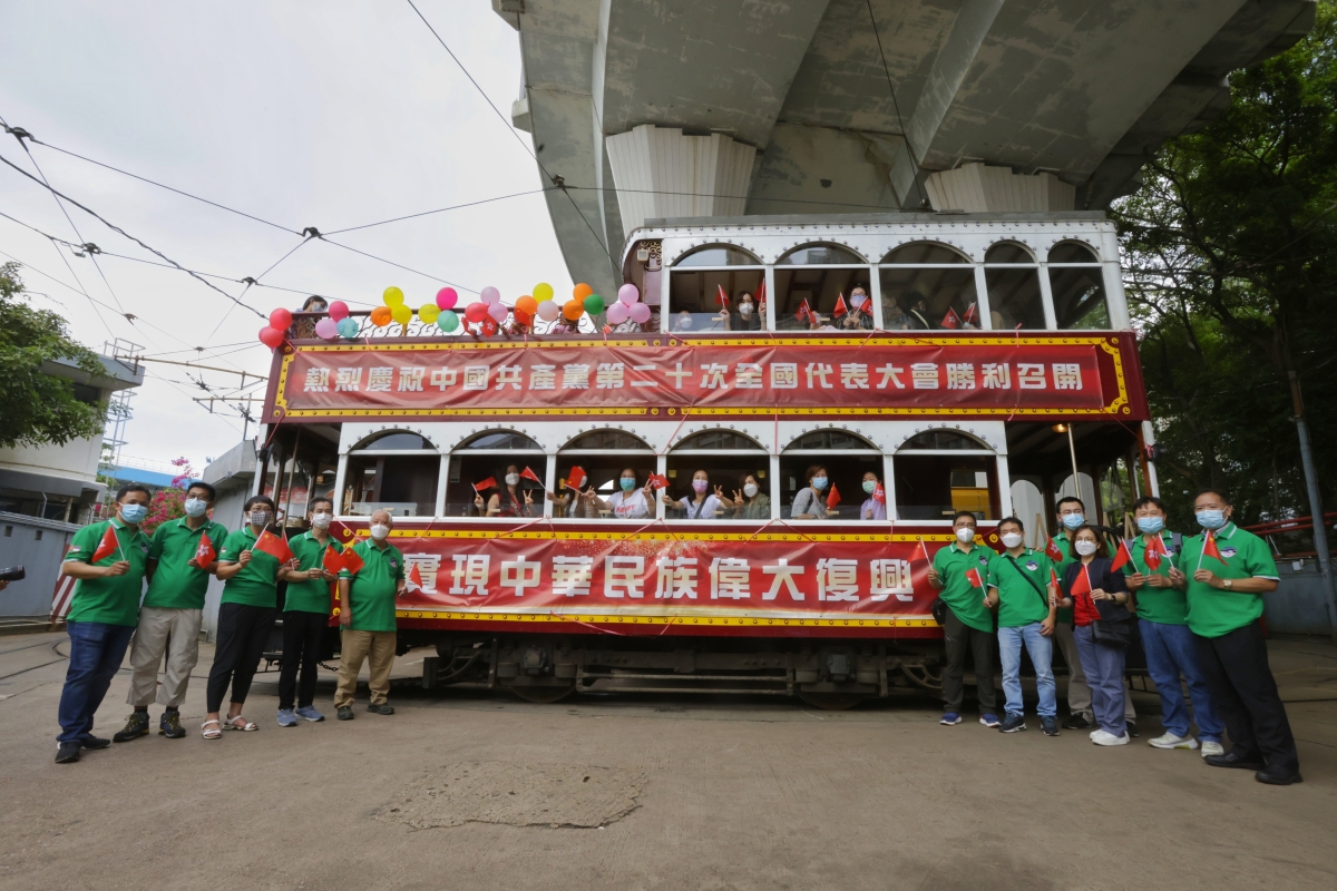 香港電車職工會租用電車進行巡遊,慶祝中國共產黨第二十次全國代表大會在北京開幕。