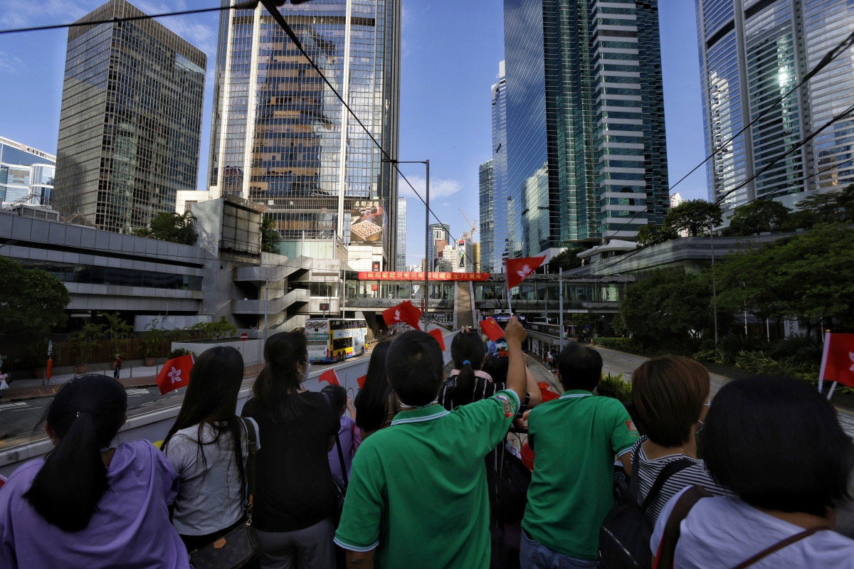 巡游車上的市民不斷舞動國旗、區旗向行人示意。