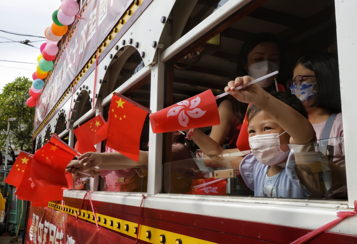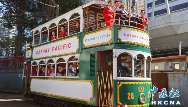 香港新聞網10月16日電(記者 曹文毓)10月16日,為慶祝中國共產黨第二十次全國代表大會在北京開幕,香港電車職工會租用電車,由屈地街車廠出發巡遊,成為今日一道穿梭港島的風景線。市民於車上揮動國旗、區旗共同慶祝。 電車往筲箕灣方向來回,途經港島各處,沿途中,巡遊車上的市民不斷舞動國旗、區旗向行人示意,不少過路的行人亦予以回應並拿出手機拍照留念,街道洋溢著熱鬧的氣氛。