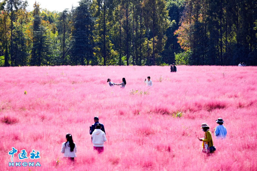 10月18日,南京三橋濕地公園內,盛開的粉黛亂子草如煙似霧,吸引了不少市民前來沐浴秋日陽光,徜徉“粉色花海”。(香港中通社)