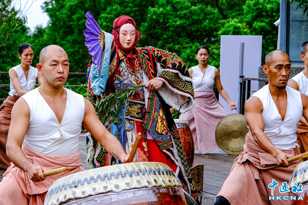 2022台北地景公共藝術計畫,19日在台灣貓空開展到11月13日,結合藝術家李蕢至、成若涵的裝置藝術作品,尋找人與自然間和諧共生的里山精神。圖為優人神鼓演出,帶給觀眾振憾體驗。(香港中通社)