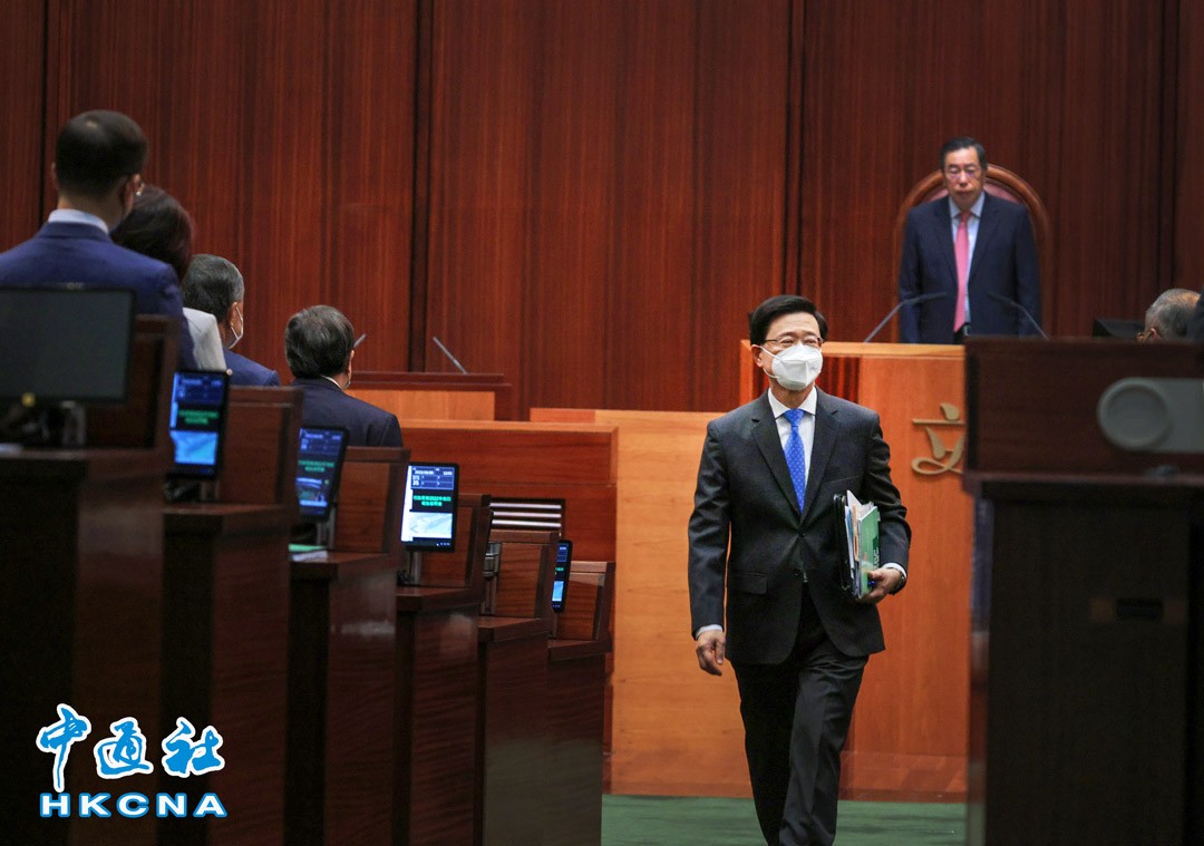 10月19日,香港特區行政長官李家超發表上任後的首份施政報告。圖為李家超步出立法會演講廳。(香港中通社記者 許其皓攝)