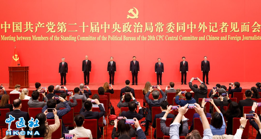 10月23日,中共中央總書記習近平和中共中央政治局常委李強、趙樂際、王滬寧、蔡奇、丁薛祥、李希在北京人民大會堂同中外記者親切見面。香港中通社)