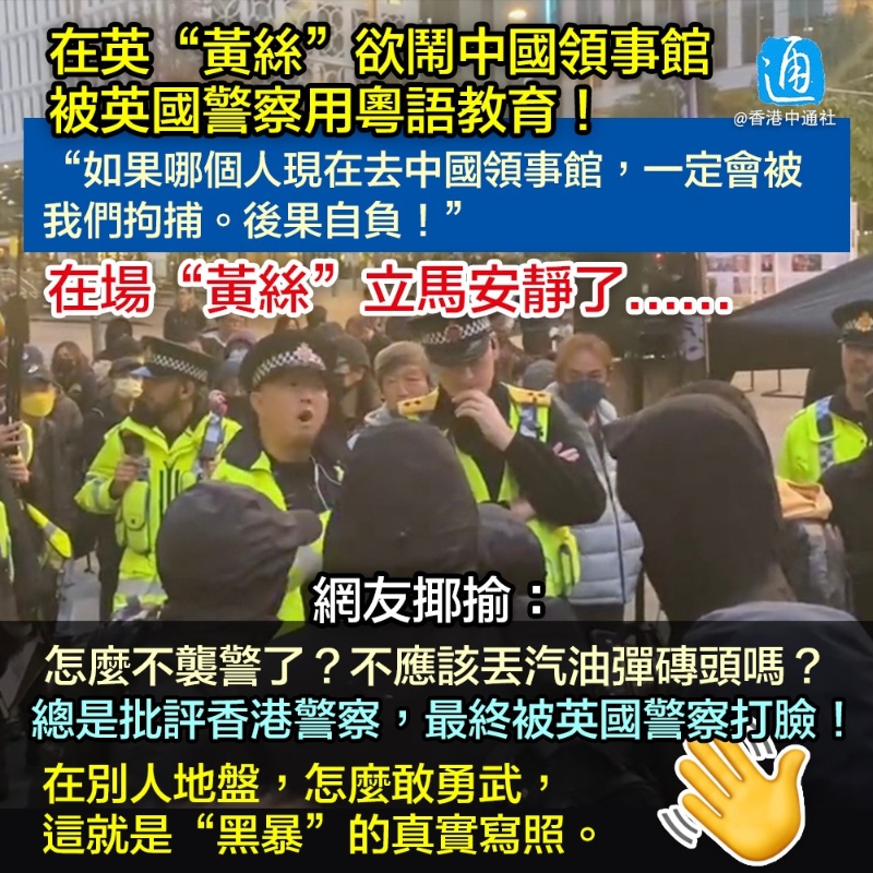 視頻截圖 然而,黑衣人搞事之心仍不死。該警察遂警告說,“如果你們現在有誰去領事館搞事的話......”此時,一旁有黑衣人不滿地說:“我們去一定是搞事嗎?” “總之已經建議你們不要去領事館了。”該英警直指,“如果你們去領事館的話,後果自負!” 也許是這位英警看上去是位華裔而非白人,其話音剛落,有黑衣人開始爆粗口對其進行辱罵,隨即遭英警警告“不要再說粗口”……被英式執法“威懾”到的黑衣人很快變身“鵪鶉”、不再開口。 “黑衣人終於明白(警察執法的)國際標準是什麼了。”影片其後於香港網絡流傳後,不少看過視頻的香港網友紛紛揶揄:“(黃絲)總是批評香港警察,就被英國警察打臉!” 黑衣人在香港時就打砸燒,如今到了英國被警察教育後卻不敢輕舉妄動,有網友反問:“怎麼不襲警了?不應該丟汽油彈、磚頭嗎?” “在別人地盤,怎麼敢勇武!”還有網友嘲諷稱,“人在海外,不敢‘勇武’,昔日氣焰早已煙消雲散,這就是‘黑暴’的真實寫照。” 眼見這些生事的移英“黃絲”全部黑衣遮面,有網友忍不住直批這些搞事者“無恥又無賴”,“說是和平示威,先讓這班人摘口罩,夠膽就以真面目示人。” “真心看不起這些人。”也有網友揭批道,“(黃絲)在英國搞事怕被抓,更怕BNO居留身份被取消。這班廢柴,出來混又怕要還。”