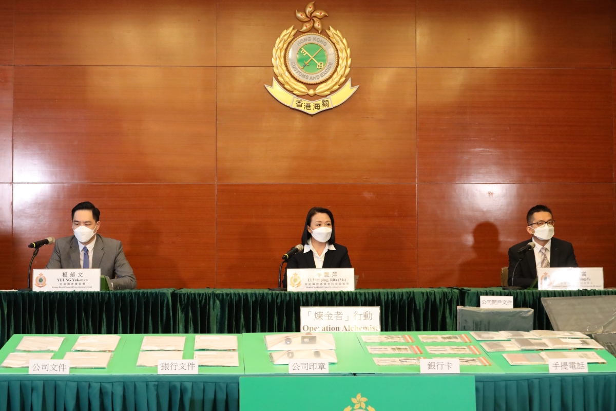 香港海關有組織罪案調查科高級監督李艶萍(中)、海關有組織罪案調查科財富調查課監督楊郁文(左)和海關有組織罪案調查科財富調查第一組指揮官黃貞富在海關總部大樓舉行記者會。